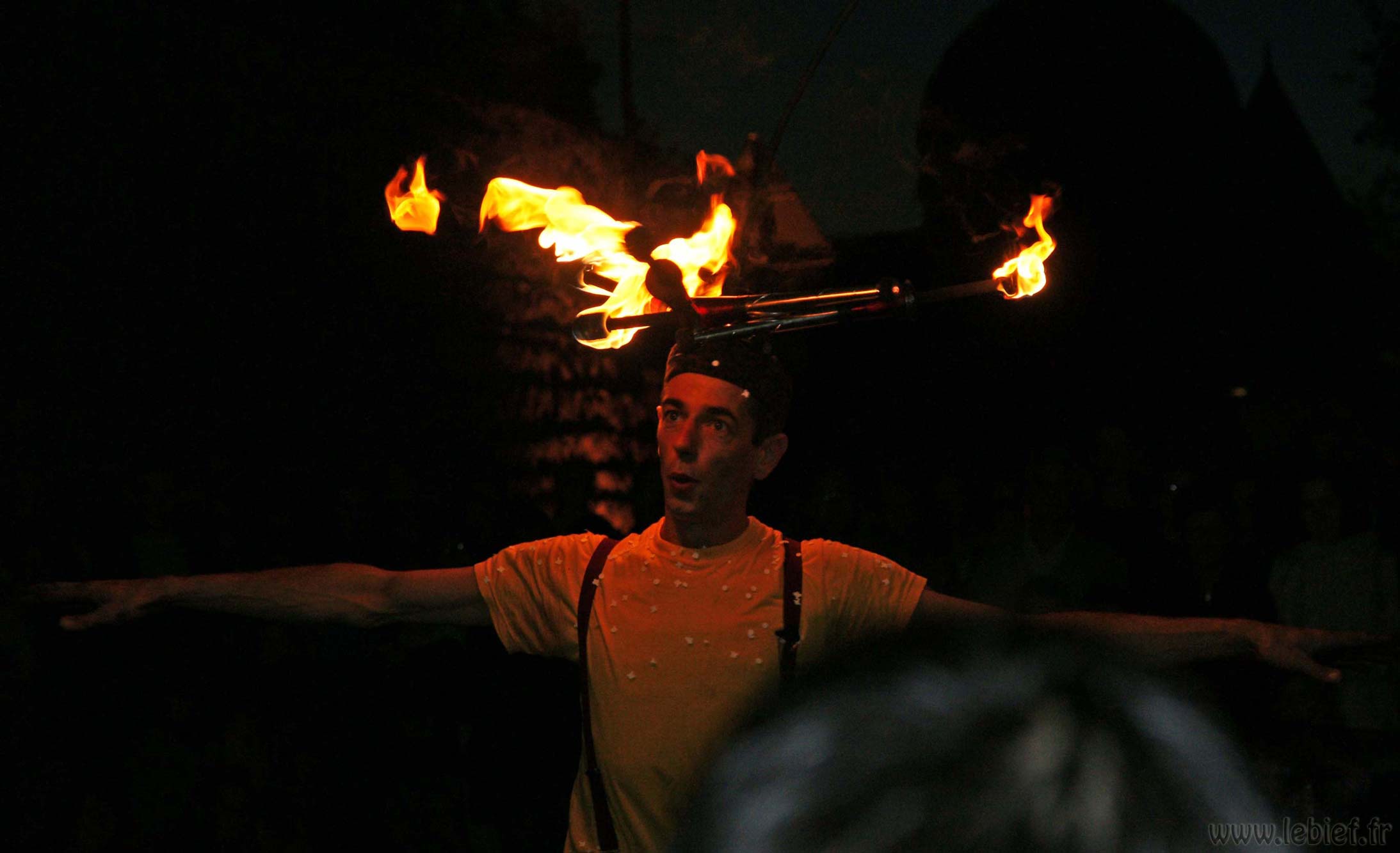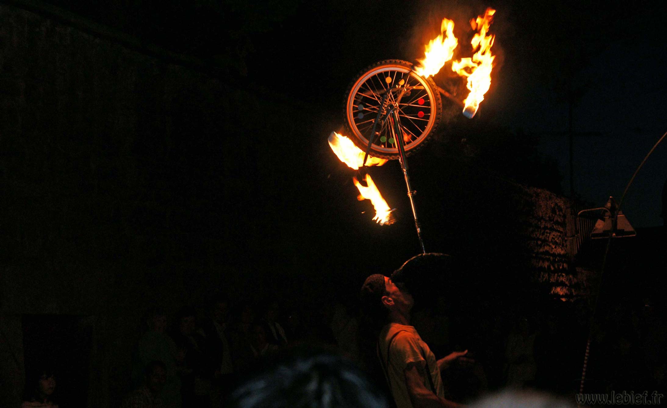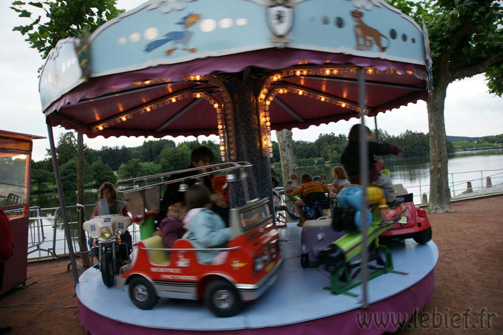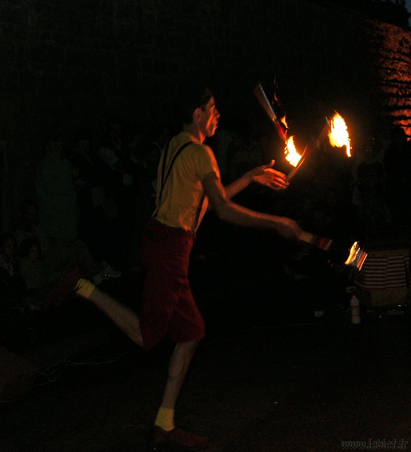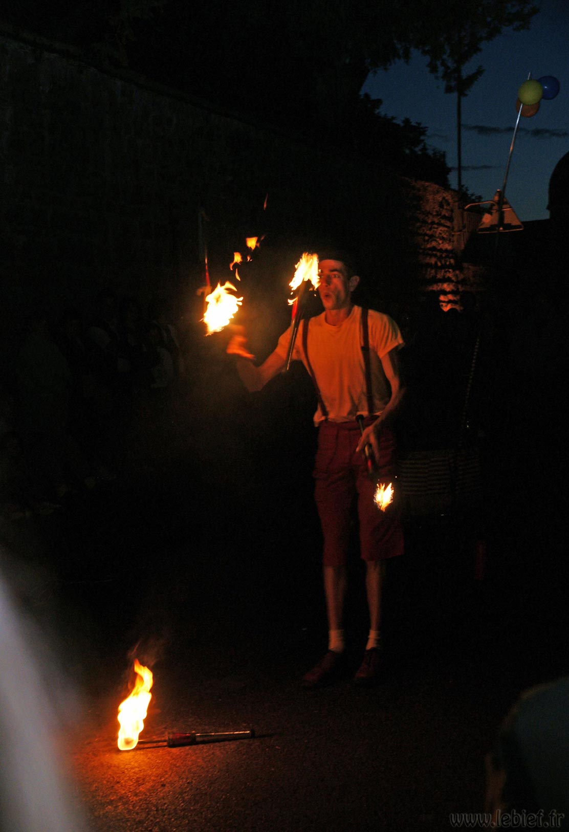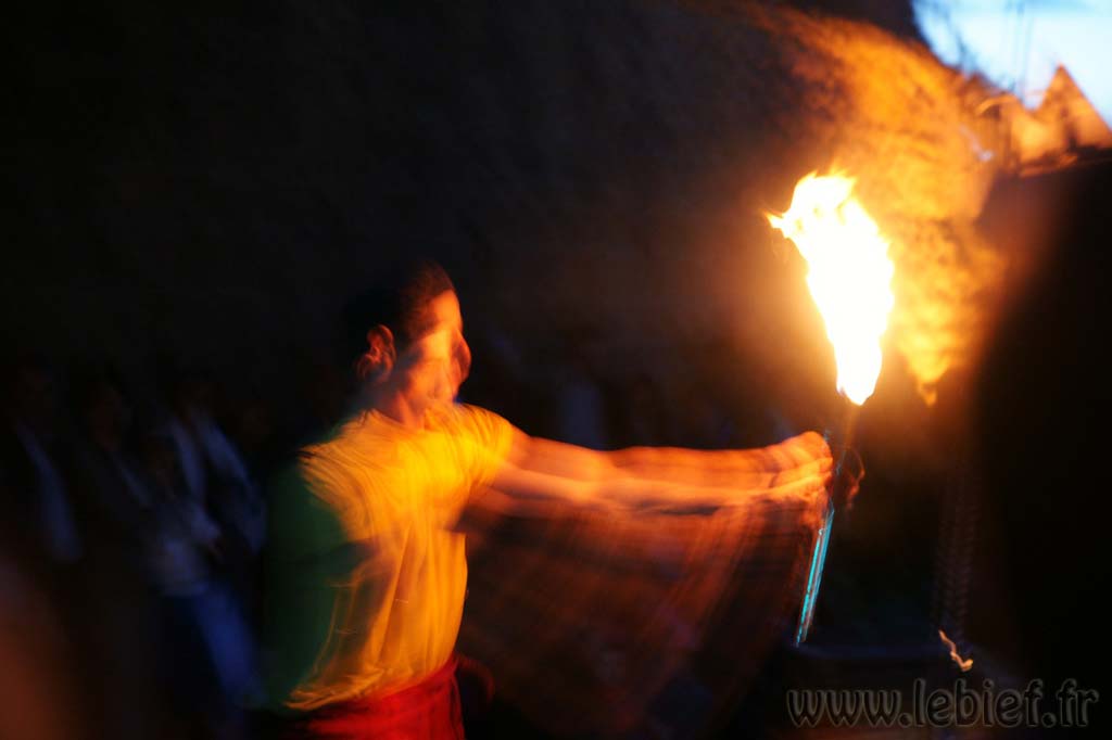 Après une entrecôte servie chaude dans des assiettes en plastique (et donc arrivée froide à table :o/ ) accompagnée de frites (chaudes celles-ci), une petite promenade sur les quais en attendant la nuit, quelques tours du petit manège dressé pour l’occasion (si si, quand je dis petit, ce n’est pas au figuré :o) ), nous avons assisté à un spectacle d’un clown jongleur qui n’avait pas froid au yeux, ni ailleurs en fait. Après ce très impressionnant intermède a enfin démarré un beau feu.