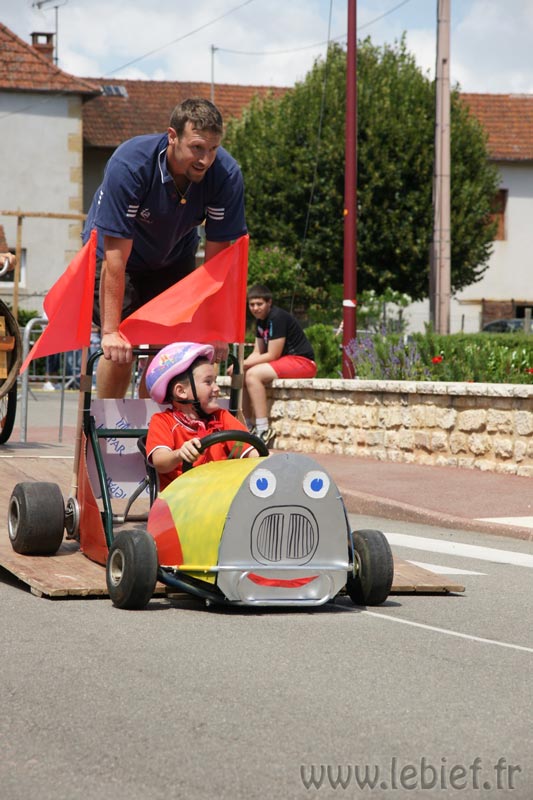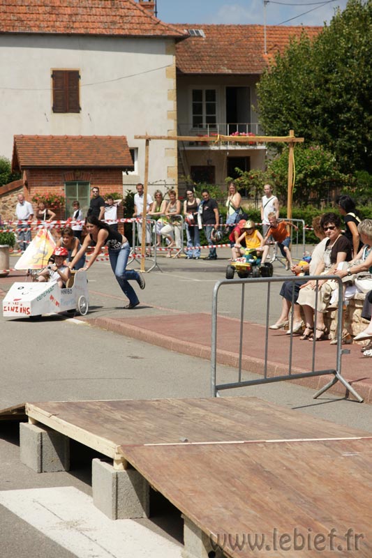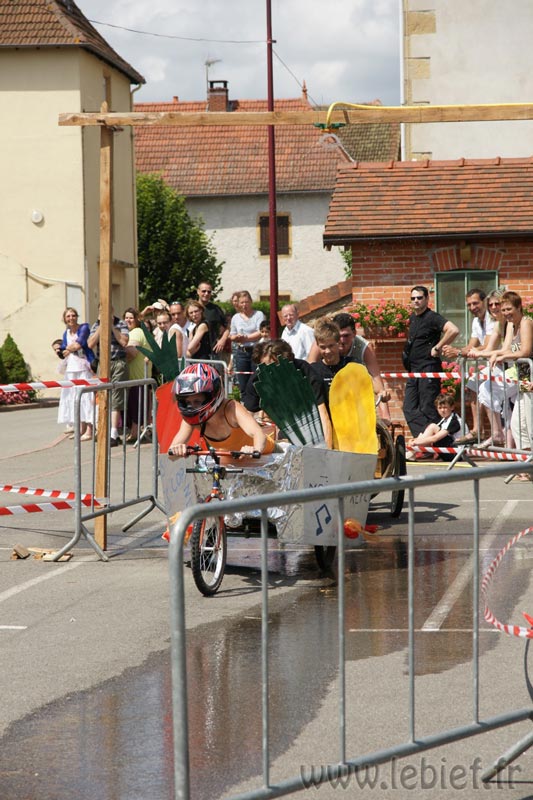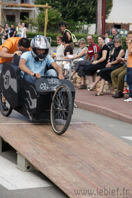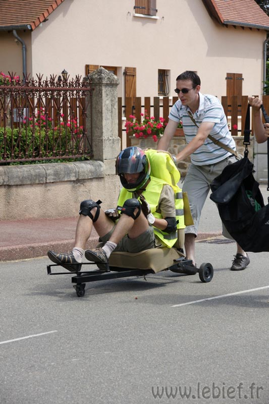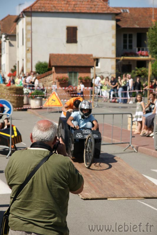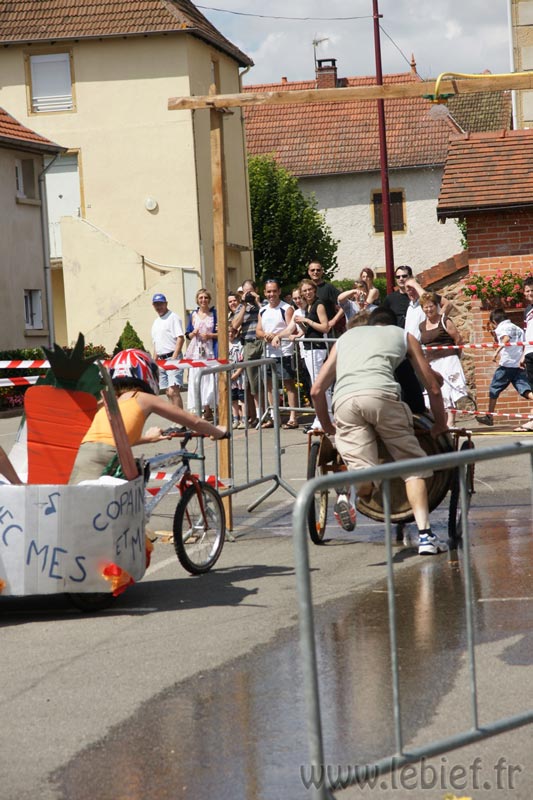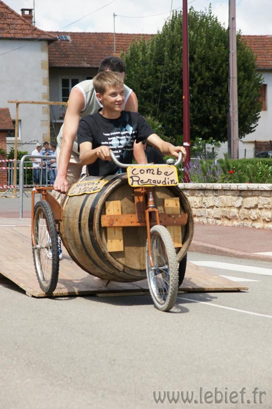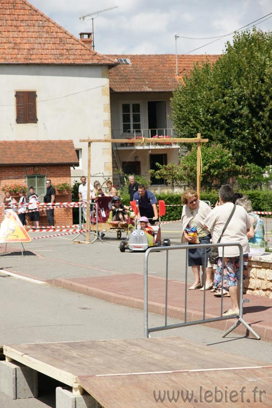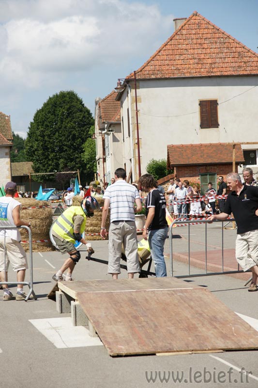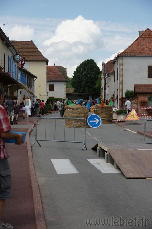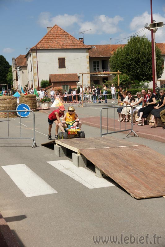 Après le Festicheval le matin, nous étions très impatient d’assister à la course de l’après-midi. La rue principale de Chassigny était carrément bouchée pour l’occasion, la municipalité ne fait pas les choses à moitié :o), et servait de circuit aux engins fabriqués maison par des habitants motivés de Chassigny sous Dun.