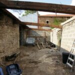 Parce qu’avant de frapper, c’est démonter qu’il faut. Enlever les charpentes, en chêne je précise… mmmm, c’est lourd, mais c’est beau. J’ai commencé par grimper sur le toit du « garage » en parpaing et ai démonté tout ça, ou presque, pour les 3-4 plus grosse, j’attends du renfort car elles sont un peu lourdes pour moi tout seul.