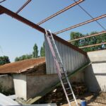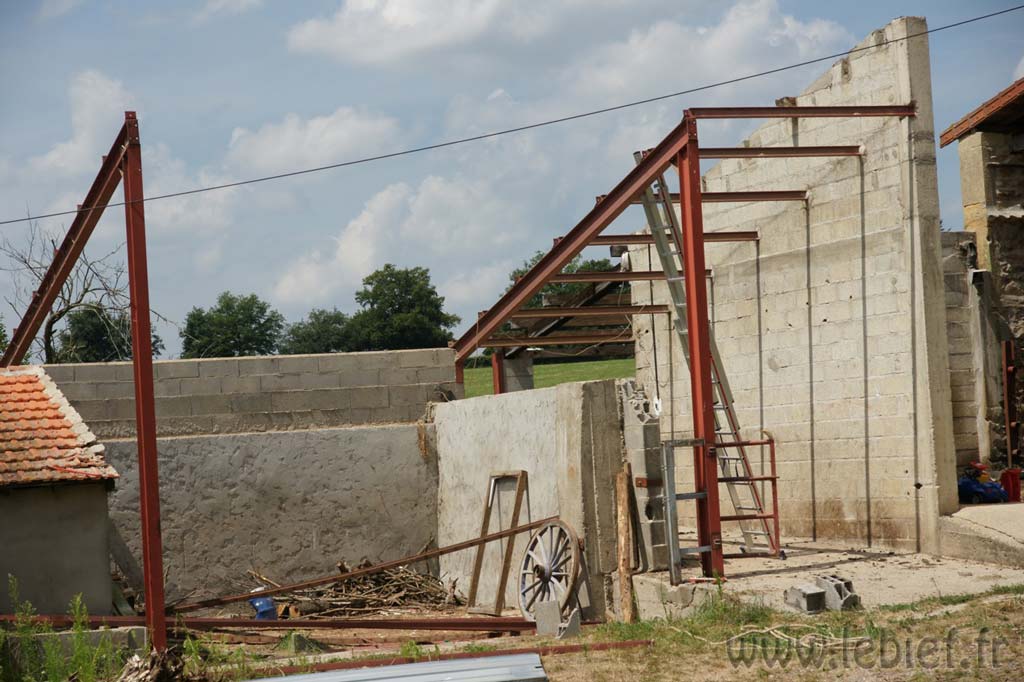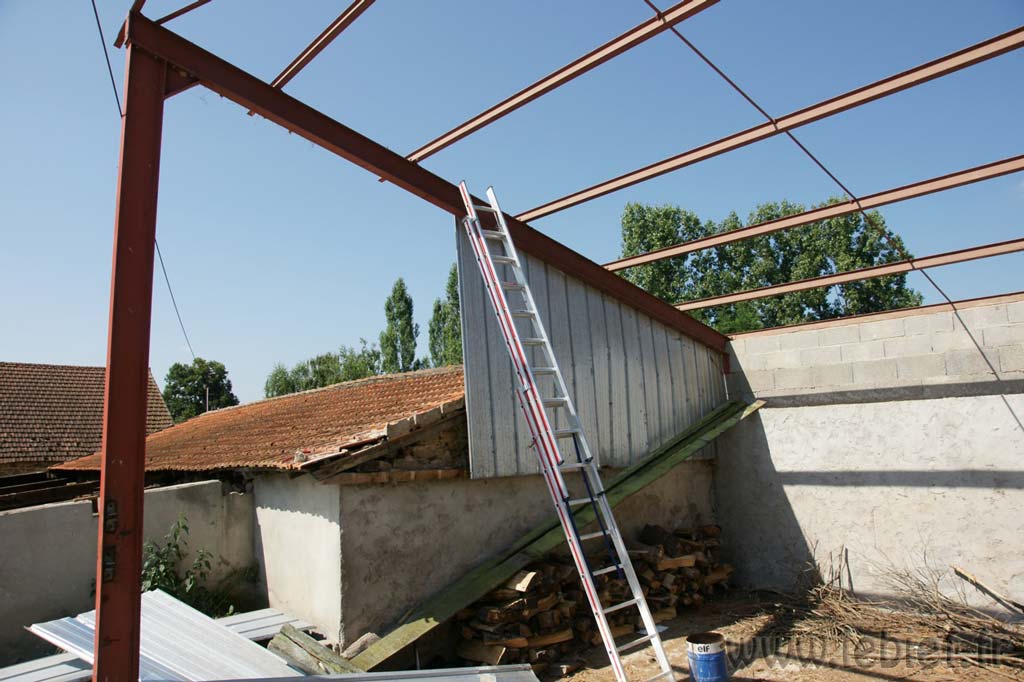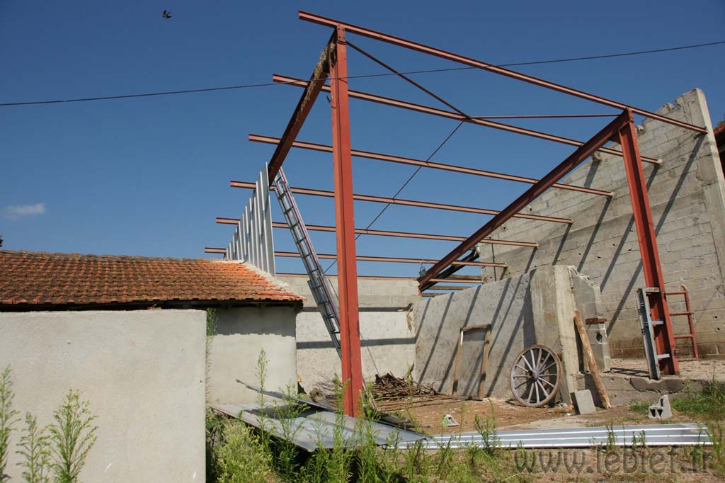Ensuite, je suis allé faire un peu de mécano en altitude pour démonter les poutrelles en acier (IPN). Fouchtra, c’est lourd ces machins là, heureusement, ça ne casse pas en tombant, sauf les oreilles, et quelques tuiles quand ça tombe sur le toit, hum… ;o)