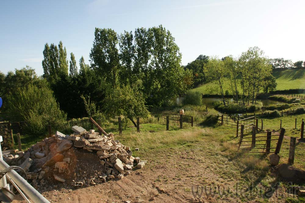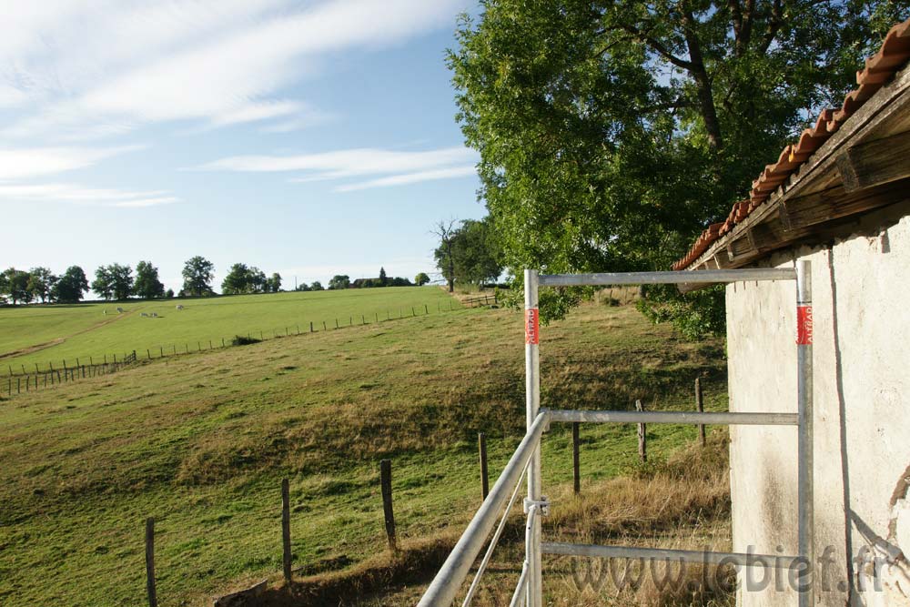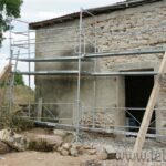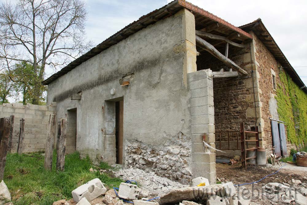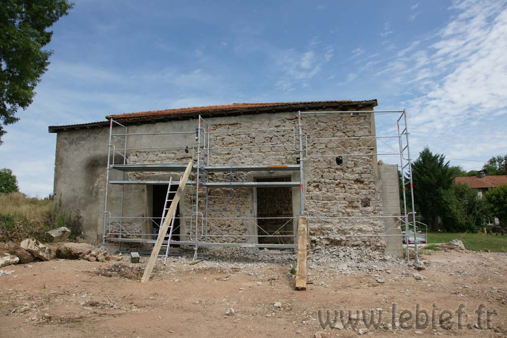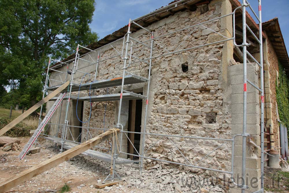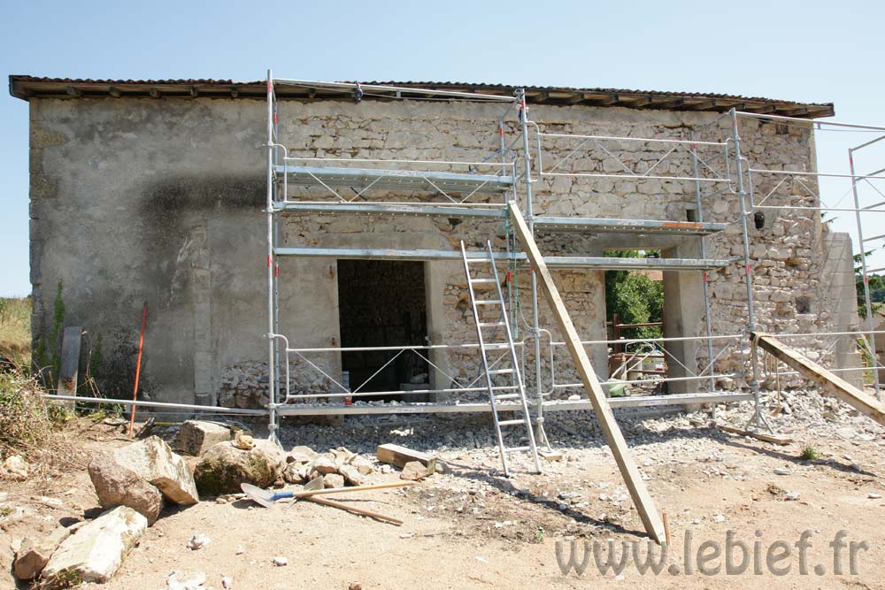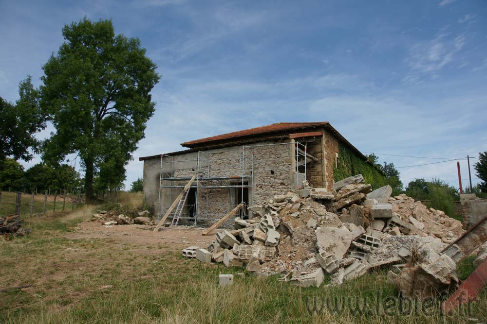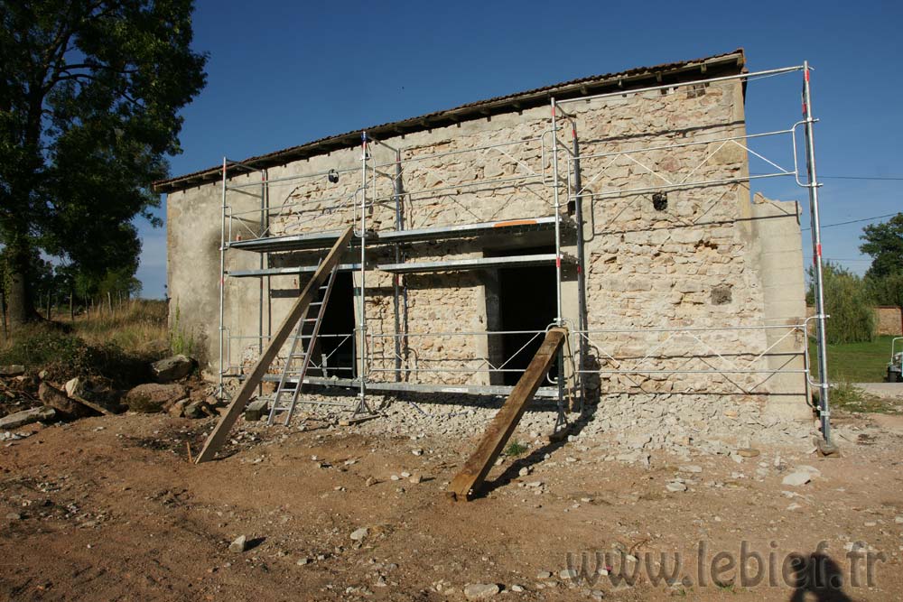 Merci à Matthieu donc, et merci à toi Youry et Stéphane de m’avoir aidé à monter l’échafaudage. J’ai eu à le modifier seul par la suite (cf photos plus bas), c’était nettement moins rapide :o). Et encore merci Stéphane pour avoir poursuivi par l’anéantissement d’une bonne moitié de cet épais ciment. Car oui, ceux qui en avaient mis là devaient avoir des actions chez Lafarge parce que la dose y était. Il est vrai qu’à cet endroit se trouvaient des couloirs étroits dans lesquels circulaient les vaches qui allaient vers la partie étable, ou qui étaient immobilisés dans l’appareil vert en métal qui se trouve caché au centre de la photo, et c’est là qu’on les piquait. J’en ai retrouvé d’ailleurs des flacons et des pointes de seringues dans ce coin là. Pfffff… Bref. J’ai déjà parlé du démontage de ce bâtiment, cette fois c’était le tour de l’enduit ciment qui recouvrait entièrement le mur ouest.