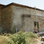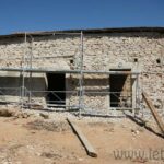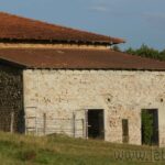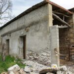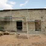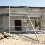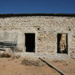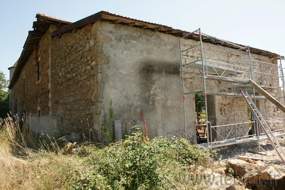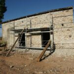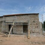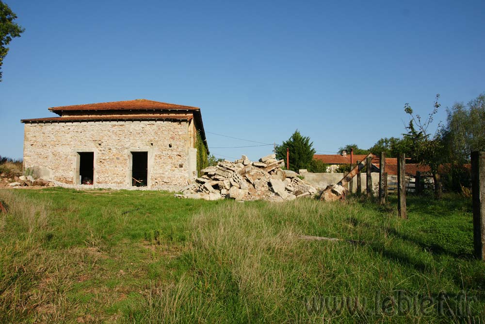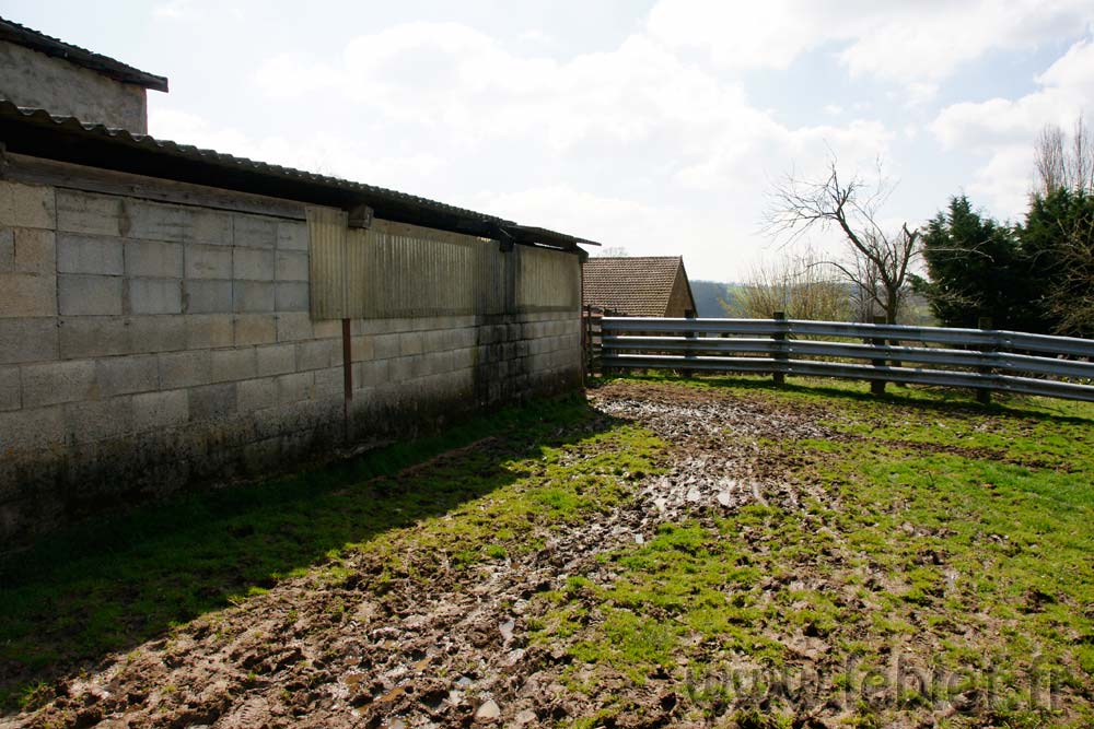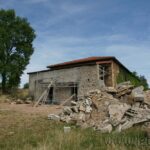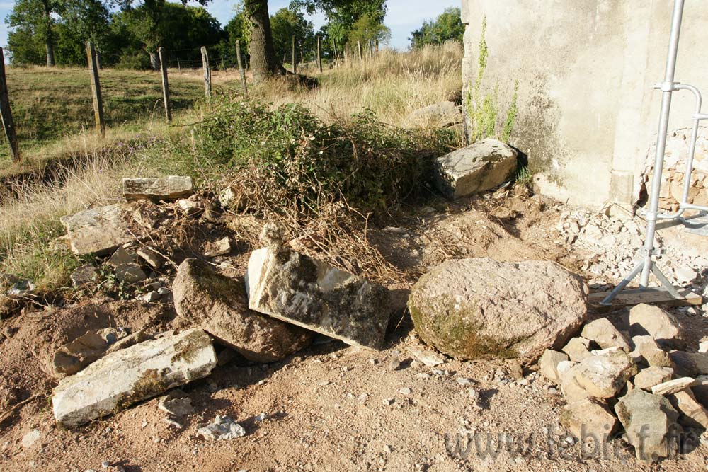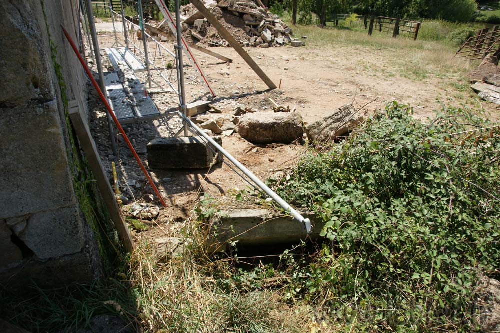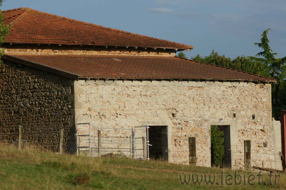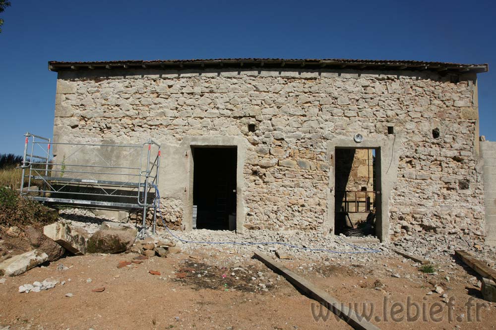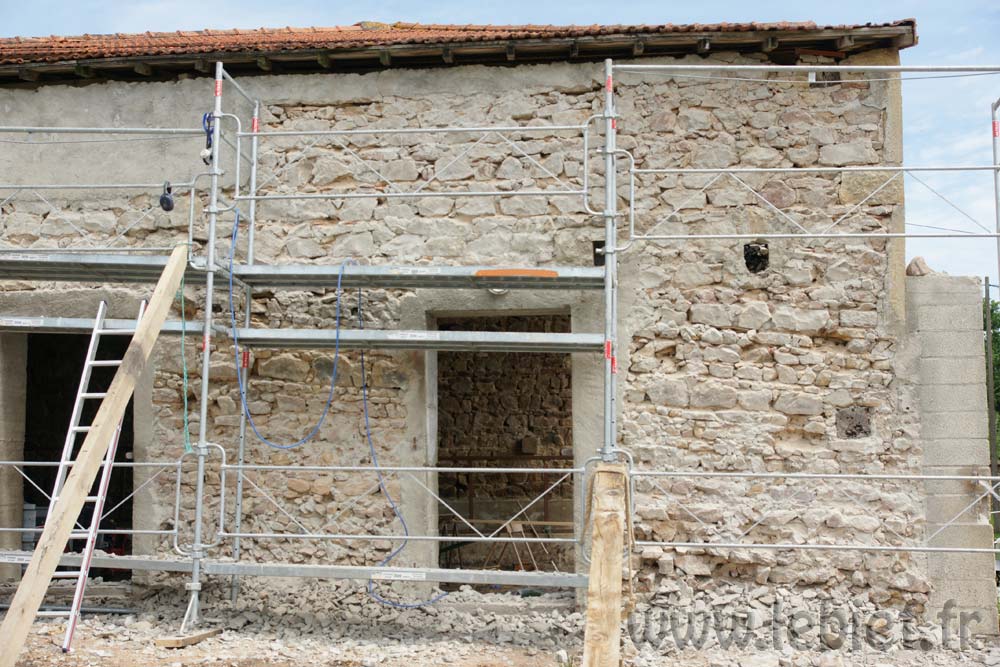 Merci à Matthieu donc, et merci à toi Youry et Stéphane de m’avoir aidé à monter l’échafaudage. J’ai eu à le modifier seul par la suite (cf photos plus bas), c’était nettement moins rapide :o). Et encore merci Stéphane pour avoir poursuivi par l’anéantissement d’une bonne moitié de cet épais ciment. Car oui, ceux qui en avaient mis là devaient avoir des actions chez Lafarge parce que la dose y était. Il est vrai qu’à cet endroit se trouvaient des couloirs étroits dans lesquels circulaient les vaches qui allaient vers la partie étable, ou qui étaient immobilisés dans l’appareil vert en métal qui se trouve caché au centre de la photo, et c’est là qu’on les piquait. J’en ai retrouvé d’ailleurs des flacons et des pointes de seringues dans ce coin là. Pfffff… Bref. J’ai déjà parlé du démontage de ce bâtiment, cette fois c’était le tour de l’enduit ciment qui recouvrait entièrement le mur ouest.