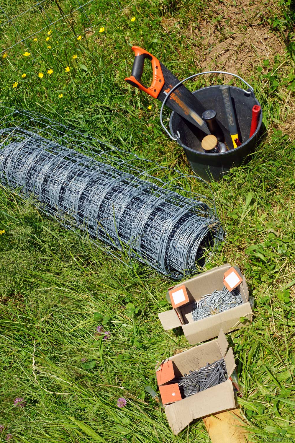 Question clôtures, à part quelques notions de base sur leur principe et utilité, il a fallu que je m’informe. Les seuls exemples autour de moi, cela dit, sont ceux de voisins, ou connaissances, éleveurs, et donc équipés pour bâtir de belles et robustes barrières grillagées. Ici, rien de tel, alors on improvise.