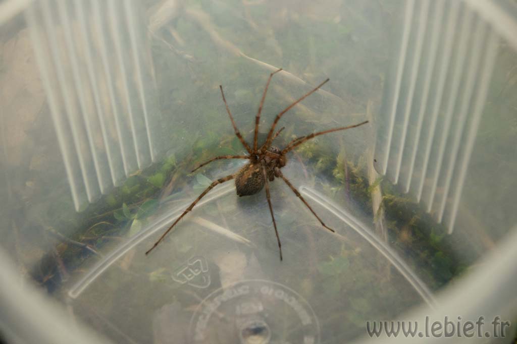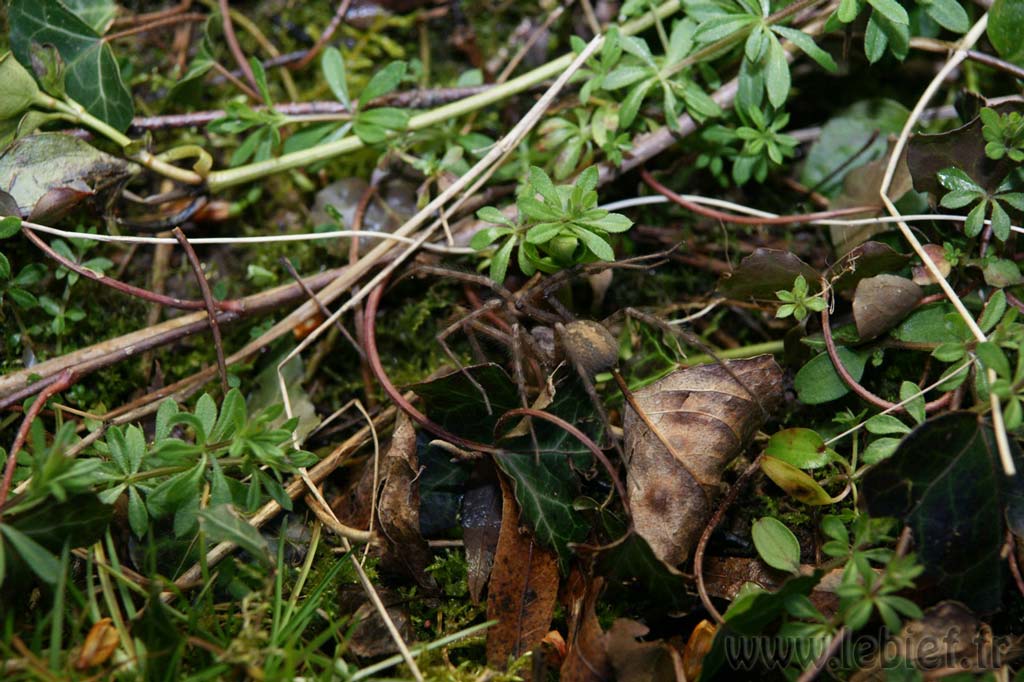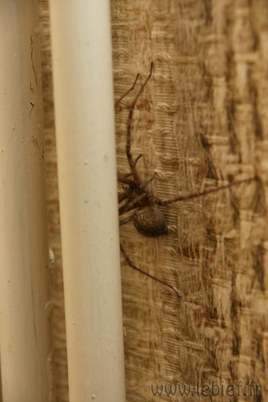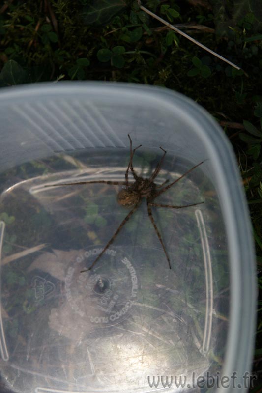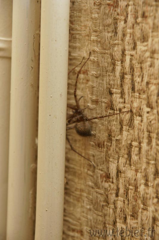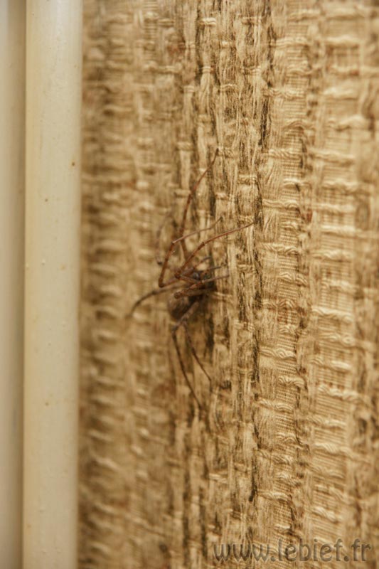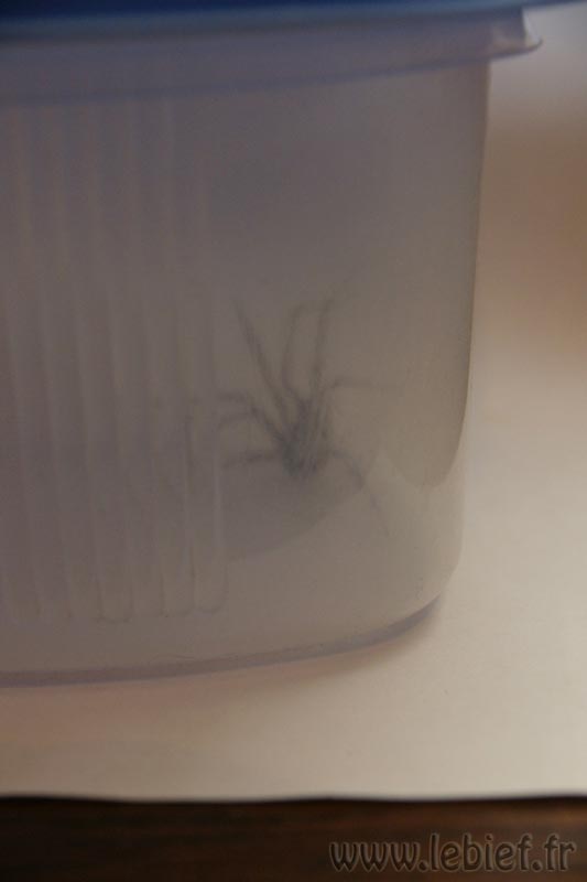 Derrière un tuyau du bureau se trouvait une tarentule. Rien de bien grave. J’ai juste eu une grosse pensée pour Marion, Serge et Sandra (il et elles se reconnaîtront (salut!)) qui adorent ce genre de compagnons, et ai cherché Virgile, qui aime beaucoup les voir, même si comme moi, il n’aime pas beaucoup quand elles bougent. Comme il se devait, il est allé vite chercher Roxane qui elle, adore arrêter son coeur à leur vue… Ceci fait, nous avons pu procéder à son évacuation, je parle de celle de l’araignée :o). Non non, chez nous, on écrase pas les insectes, sauf les moustiques et les tiques. Et surtout pas les araignées. Il y en a pas mal ici, des faucheux pour la majorité. Mais celle là est vraiment trop grosse. On voit même ses yeux. Impressionnant. On en a pas des comme ça en Alsace. Enfin, au Stockfeld :o) Quand je l’ai évacué dehors, j’ai croisé des artisans plombier/chauffagiste (les mêmes qui ont fait les travaux de réhabilitation de la chaudière chez nous) qui m’ont surpris en train de photographier un tupperware sur le devant de la proprieté… Peut-être dorénavant les rumeurs les plus folles sur les nouveaux propriétaire du Bief à Chassigny sous Dun circuleront dans les bourgs avoisinant :o)