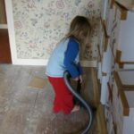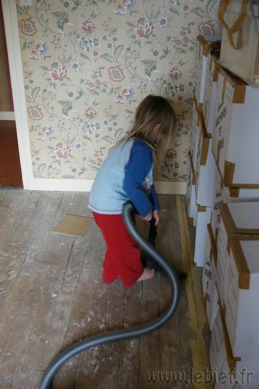 Voilà, en dessous du plancher, pour ce que nous en savons, il y a de l’avoine (une partie des pièces servaient de stockage des graines à l’époque où le four à pain d’où je vous écris servait encore (entre temps, c’est devenu un bureau, je précise :o) )), de la poussière, de la « laine » (reste encore à définir) et des galeries de rongeurs tranquilles. Voilà pourquoi nous n’allons pas encore trop loin dans le démontage des sols du 1er, c’est parce que nous savons d’ores et déjà que nous allons devoir refaire aussi l’isolation du plancher, et du plafond du 1er, car au dessus, c’est pas mieux :o) C’est donc un gros chantier, surtout quand on vit dedans avec deux jeunes enfants.