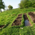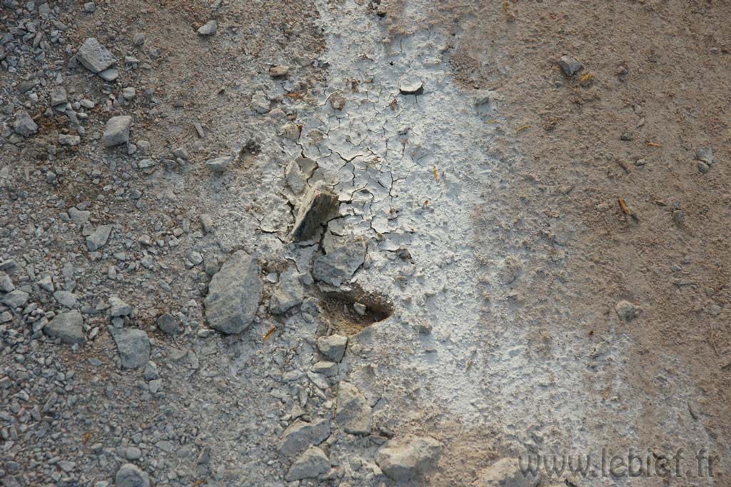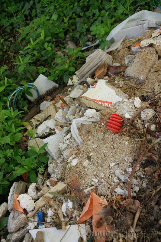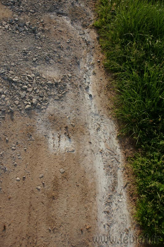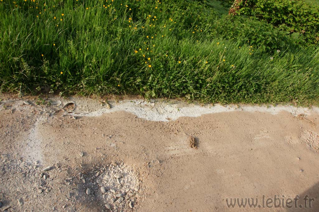 – Les voisins à côté, au château font faire des travaux de rénovations, depuis plusieurs semaines déjà. Et c’est avec circonspection que nous avons constaté que le maçon avait rebouché les trous du chemin d’accès au Bief avec des restes (ou pas) d’une sorte de mélange sable/ciment/pierres (oui oui, une sorte de béton quoi)… Le chemin avait bien besoin de réhabilitation, car ces divers travaux ont entrainé le passage de nombreux camions et utilitaires et de nombreux trous étaient apparus. Du coup, tout le monde voulant les éviter, ce sont les bordures du chemin qui ont accusé ce surplus de circulation et le chemin s’est considérablement élargi depuis que nous l’avions vu en Août. Je dis « circonspection » car nous aurions préféré de la terre/pierre brute, sans cochonceté dedans. Déjà parce que le chemin longe l’étang, ensuite parce que nous aurions aimé que l’herbe repousse là où les camions avait élargi le chemin, mais avec ces matériaux sur la figure, l’herbe risque de prendre son temps pour revenir, et le chemin, maintenant plus large, s’est aussi rapproché de l’étant et fragilise la bordure. Bon, rien de bien grave non plus, mais bon, cela aurait pu facilement être évité… Nous allons déjà voir ce que va devenir ce joli mélange coloré dans les trous…