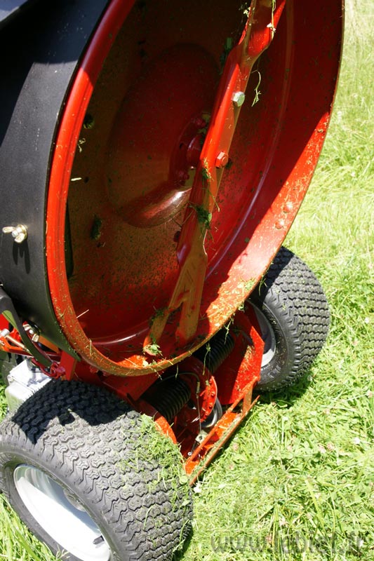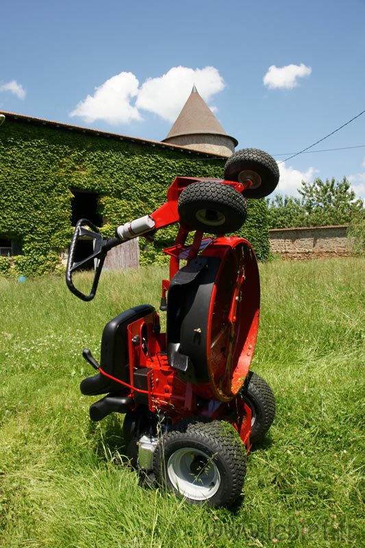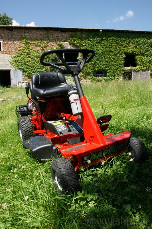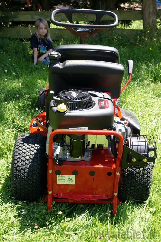 C’est une drôle de sensation quand on passe sur un trou, ou que le terrain part un peu en vrille, on bouge dans tous les sens, mais la lame elle, impertubable, reste bien droite, horizontale et poursuit son job. Le principe est simple, mécanique, et très efficace. Une bombe pour les terrains accidentés ! Mon revendeur n’en revenait pas lors des premiers essais à l’atelier. De plus, avec ses gros pneus, et ce chassis particulier, le Snapper offre une très très bonne adhérence sur terrain pentu et même humide. Il pleuvait lors des essais :o)