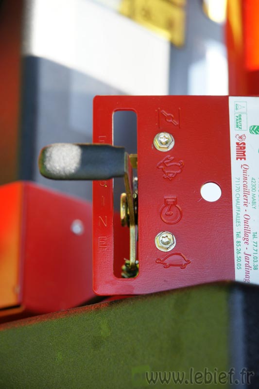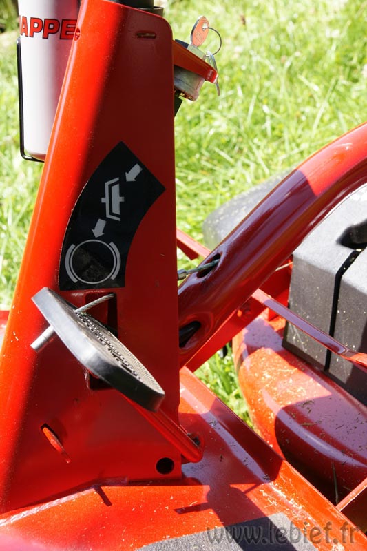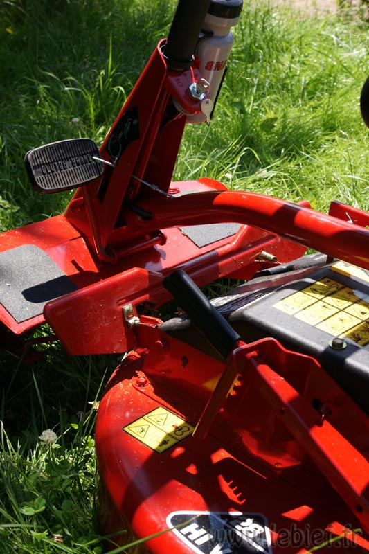 Pour avancer, c’est simple, mais étrange quand on est habitué à la voiture… Une manette des gaz à gauche, lent, moyen, rapide, starter. On choisi en fonction de ce que l’on veut, on peut changer en cours d’utilisation. Pour les vitesses, on passe la première par exemple, on lache le frein/embrayage, c’est la même pédale, et hop, ça avance tout seul, pas de pédale d’accélérateur. On veut aller plus vite ? on freine/embraye, on s’arrête donc, on choisi celle que l’on veut (2ème, 3ème, 4ème ou 5ème, pas d’ordre particulier à respecter) et c’est reparti. Il suffit simplement, tout en roulant, de tirer ou de pousser le levier de vitesse pour tendre ou détendre le câble d’accélération.  On peut aussi s’arrêter pour modifier la vitesse en freinant-embrayant sur la pédale si on ne veut pas modifier sa vitesse sans s’arrêter. Une fois le pli pris, c’est très efficace et ça ne pose aucun soucis à l’utilisation. Evidement, il y a une marche arrière, coupe impossible en arrière, une sécurité mécanique bloque la lame mais on peut la contourner si nécessaire en levant le pied légèrement pour que la lame ne remonte pas mais suffisemment pour que la sécurité débloque la voie vers la vitesse arrière pour le levier de vitesse, ou tout simplement écarter manuellement ce loquet de sécurité tout en enclenchant la marche arrière sans lever le pied de la pédale de la lame. Les propriétaires de snapper de ce modèle me comprendront ^_