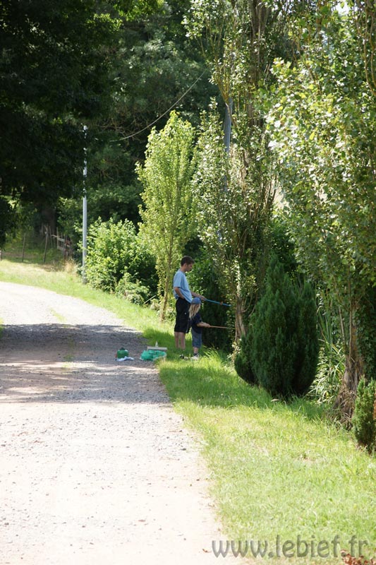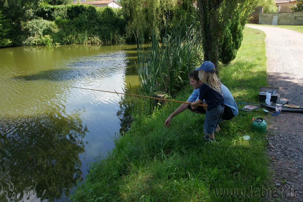 Malgré le fait que l’étang soit bien fourni en carpes, quelques perches et brochets (on en a pas vu de ceux là mais il nous a été dit que quelques couples furent introduits il y a longtemps), Guillaume n’a sorti que les petites cannes. Bon, une canne avec moulinet trempait quand même dans l’eau au cas où, mais il était très affairé avec Virgile, car les gardons ne cessant de mordre, il fallait toujours être à ses côtés pour détacher les poissons que Virgile sortait. Il valait mieux pour la bouche du poisson que cela soit Guillaume qui ôte l’hameçon. :o)