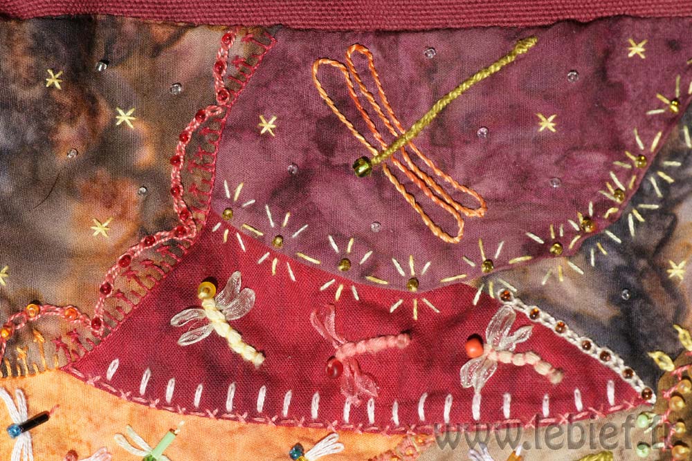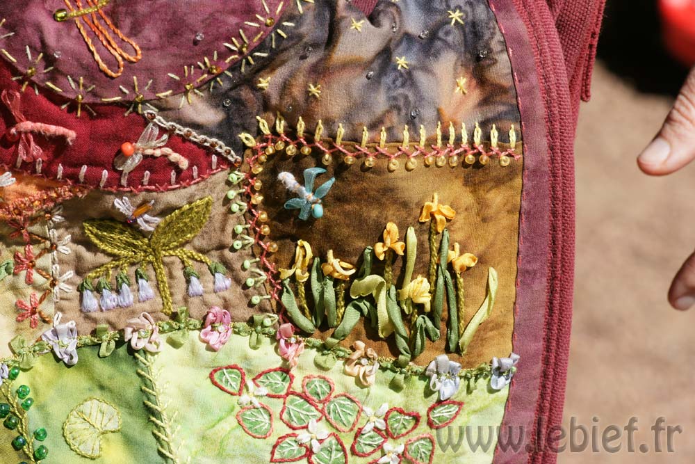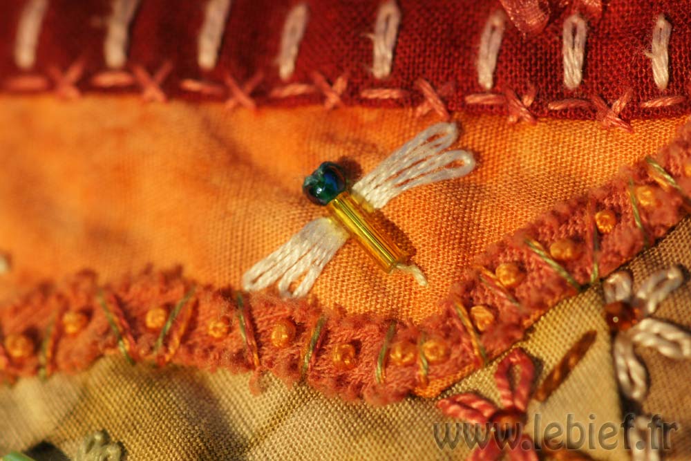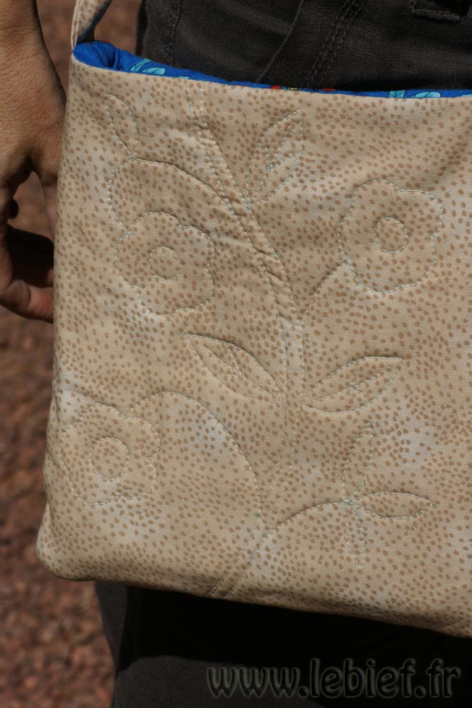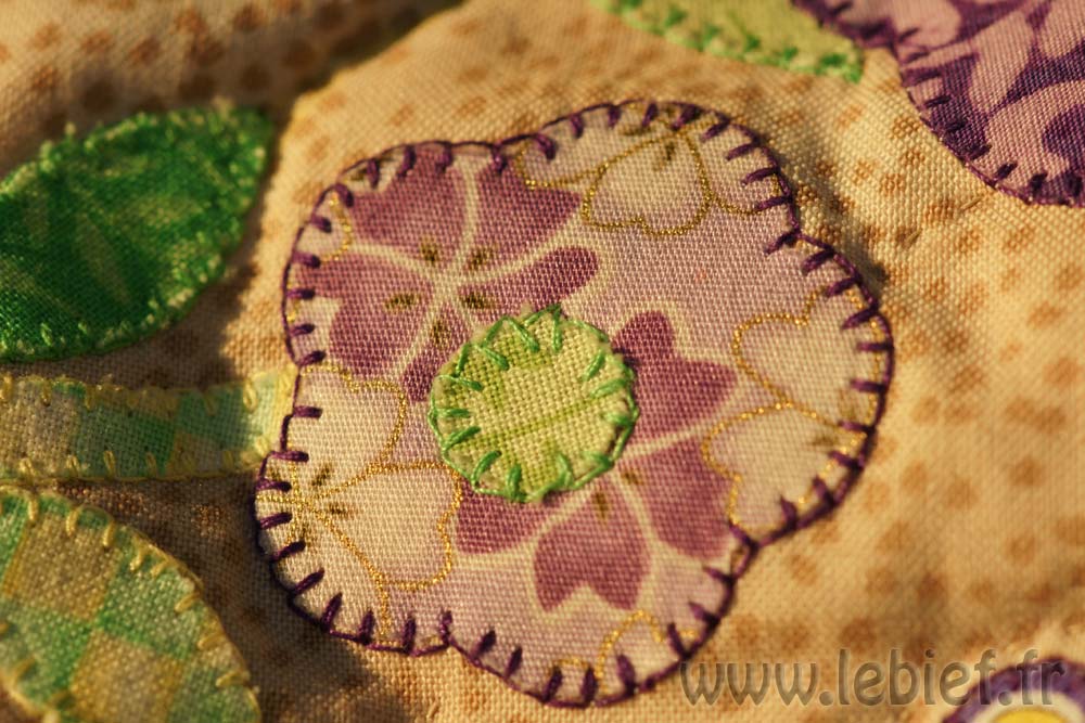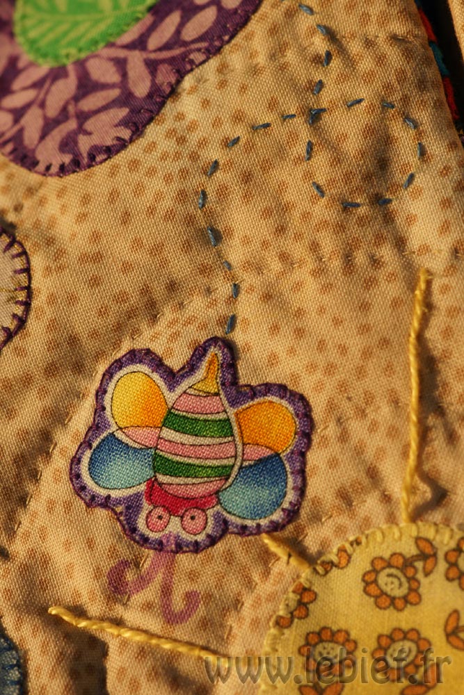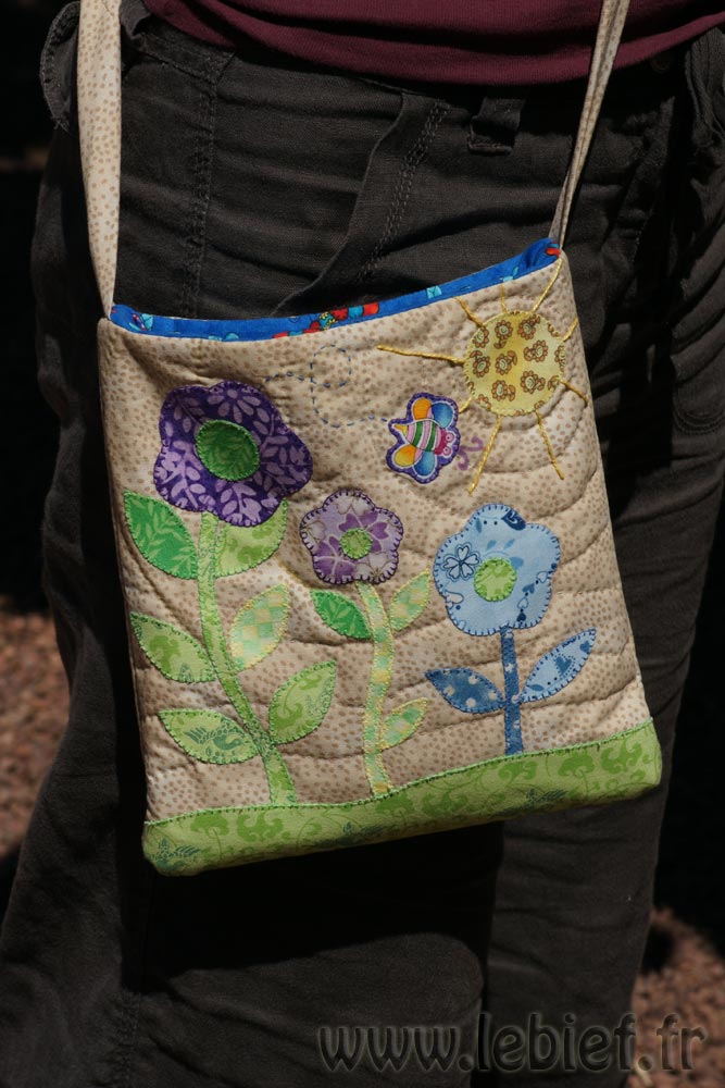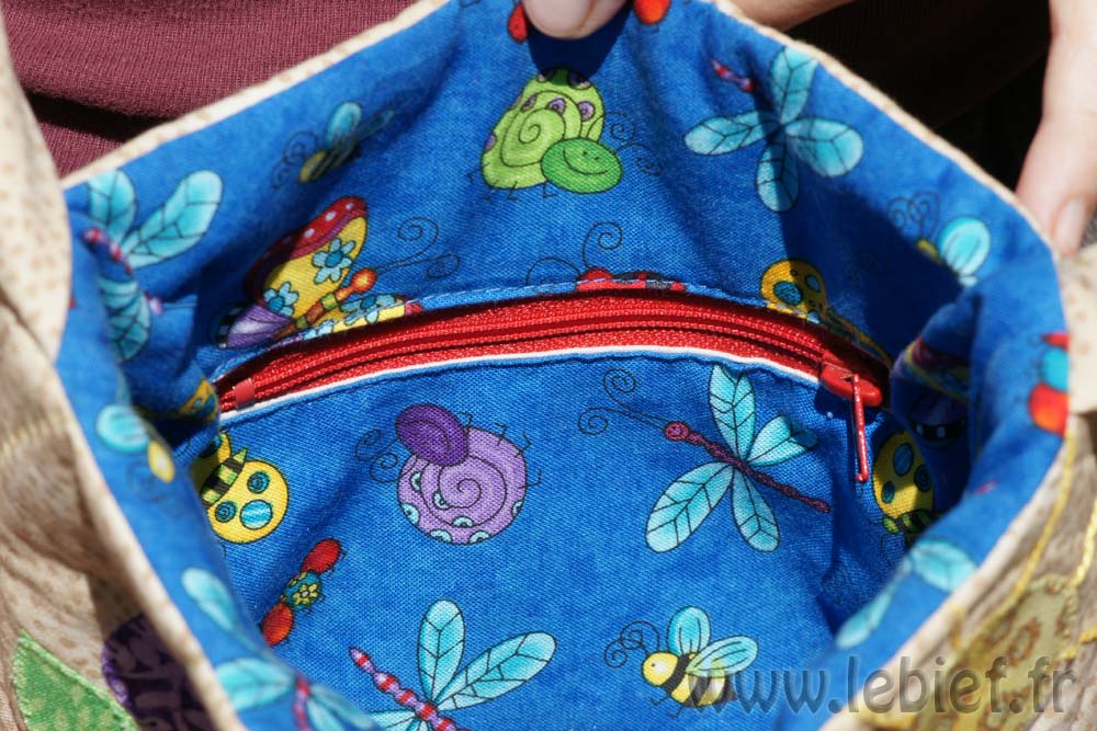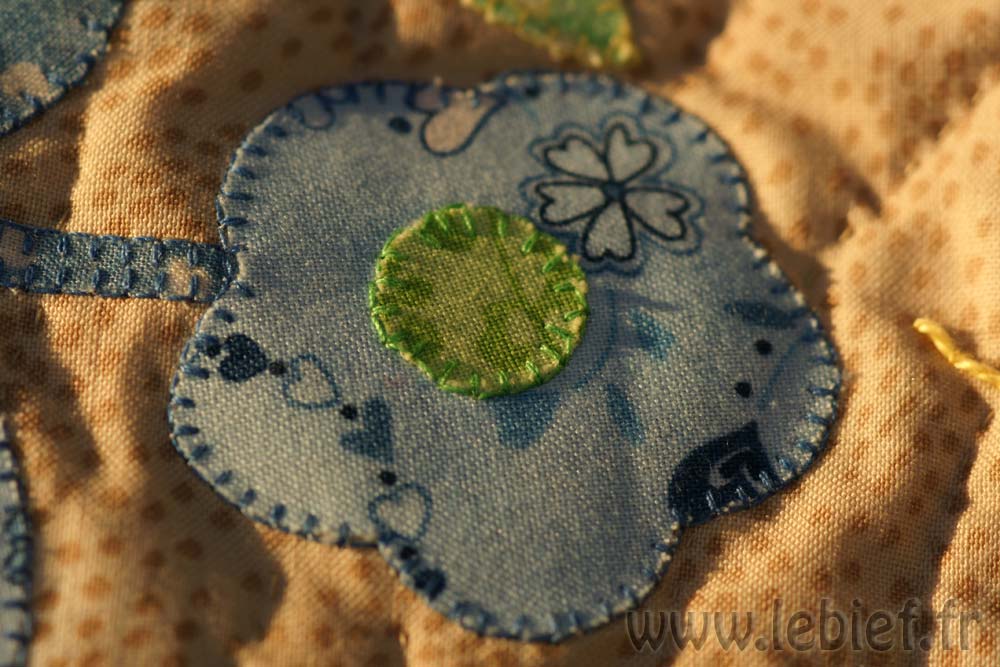 Du coup je me suis dit que j’allais me faire un mini-sac estival, histoire de pouvoir emmener papiers, chéquier, avec en prime une petite poche zippée pour la CB et le tube de granules d’arnica. Pour le faire je me suis inspirée des fleurs de Diane Lane (non, pas l’ex de Christophe Lambert, mais la quilteuse) et je n’ai pas pu m’empêcher d’y réserver une place pour la petite abeille qui me fait complètement craquer avec ses yeux tout ronds :o)