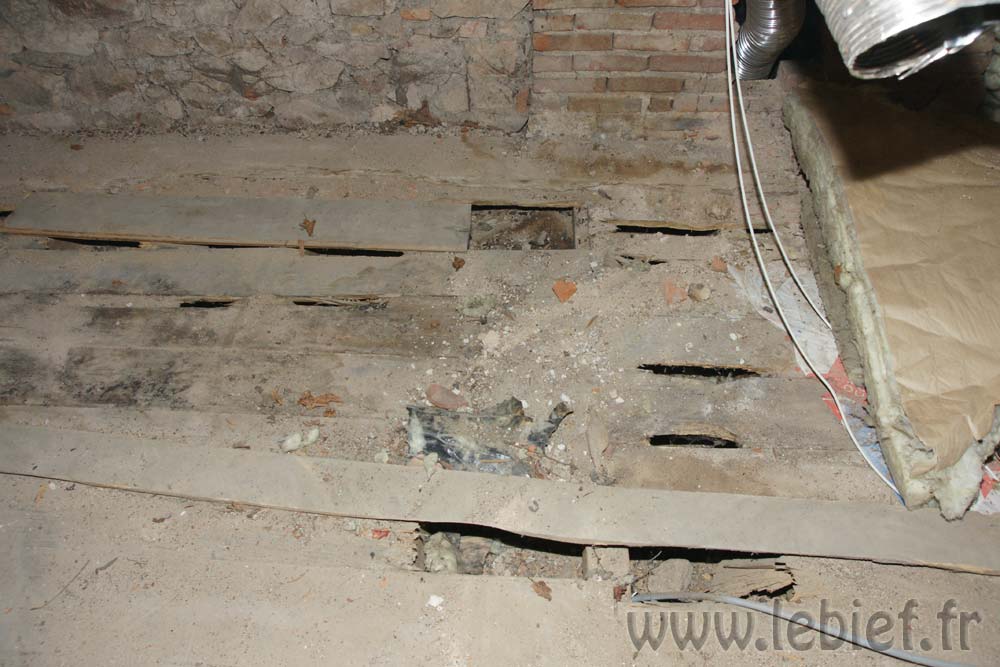 Eh oui, autant le dire tout net, l’état du plancher de cette partie des combles, juste au dessus des chambres donc, n’est pas au mieux. Nous devrions en fait le rénover avant d’isoler. Si nous n’avions qu’un chantier en cours, c’est ce que nous aurions fait, mais avec la réhabilitation des stabulations qui nous attend, on se garde ça pour un peu plus tard :o)
