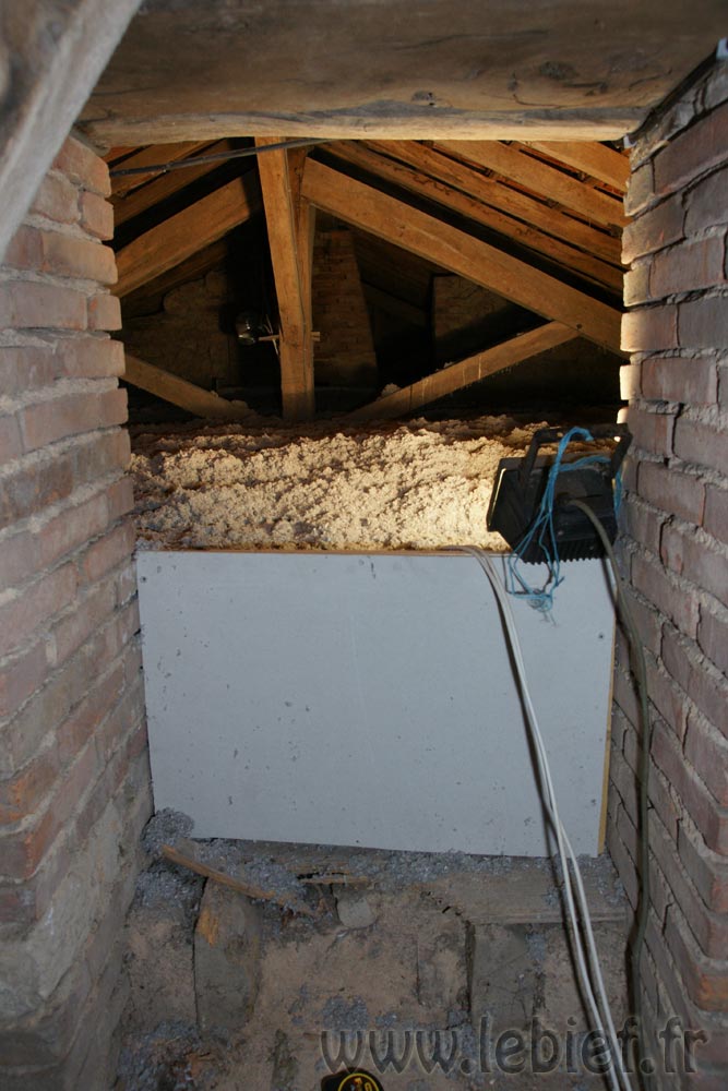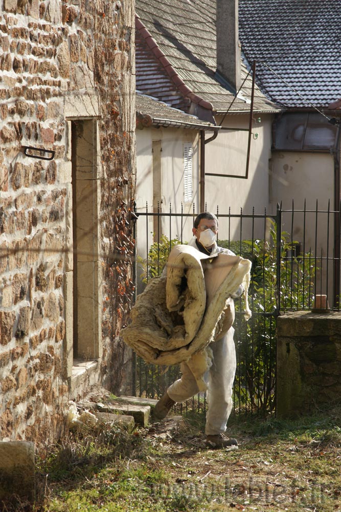 A Strasbourg, juste avant de partir, je m’étais déjà lancé dans ce type de travaux, sur notre maison en béton des années 70, et j’en avais bien bavé (mais ceci est une autre histoire), on avait en tout cas opté pour de la ouate de cellulose. Bon, pourquoi pas ici, ce sont des combles de toute façon que nous n’utiliserons pas, nous avons assez d’espace comme cela. Nous avons rajouté des devis pour du chanvre en vrac aussi, mais bien que beaucoup plus noble, ce matériau si multifonctionnel est aussi beaucoup plus cher (environs 50% de plus que la ouate). Son avantage néanmoins c’est que c’est un très bon isolant phonique en plus que thermique, mais comme c’est un point qui ne nous concerne pas pour les combles, nous avons donc opté pour la ouate. Restait à trouver un artisan dispo et de confiance pour souffler tout ça…