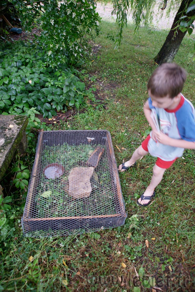 Bien entendu, cela n’a l’air de rien, mais entre trouver les planches, le matériel, le grillage de récup, la conception, c’est encore une partie de l’après-midi qui file. Mais au vu du plaisir que cela a procuré à Virgile qui est très content de ce nouvel abri pour ses escargots, c’est tout sauf du temps perdu, les escargots partagent d’ailleurs mon avis qui ont quitté leur seau en plastique avec joie ^_^