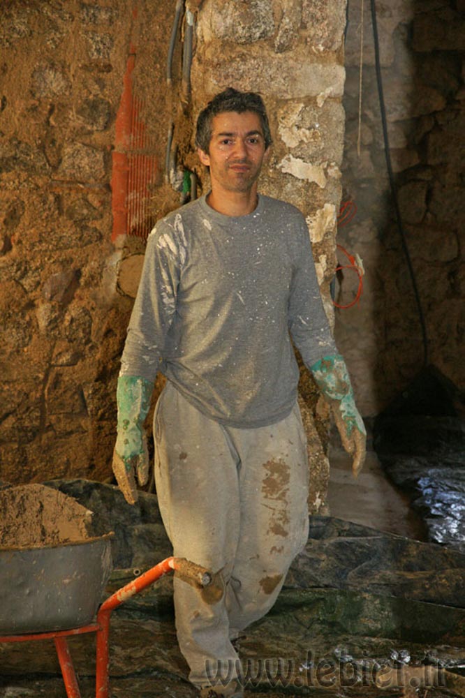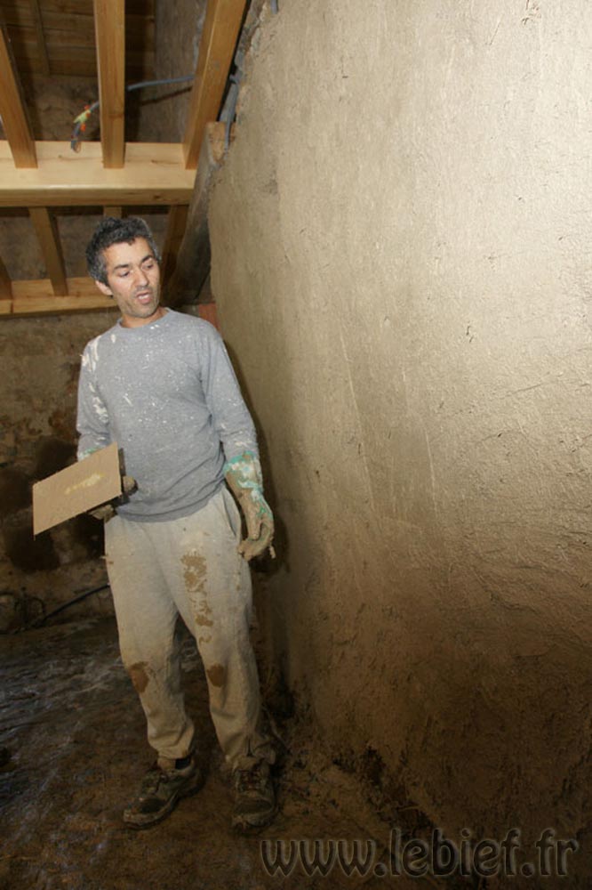 Reste juste à en splatcher le contenu sur les murs à enduire. Ces murs ont été arrosé la veille par Dimitri, et le seront encore dans la journée. Splastch. Tout aussi facile à dire qu’à faire, avec un mortier de bonne qualité, ni trop sec, ni trop humide et le nec plus ultra de ces matériaux comme la terre et la chaux, c’est qu’on a un peu de temps pour les appliquer sensuellement sur les murs. Le rugue ciment lui se doit d’être appliqué très rapidement car il sèche (et casse :o) ) très vite. Les enduits chaux, et terre-chaux, eux sont souples, au sens propre et figuré d’ailleurs, et acceptent donc volontier de se faire étaler soigneusement, amoureusement, sensuellement, à la main gantée, tout en courbes.