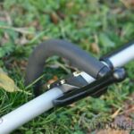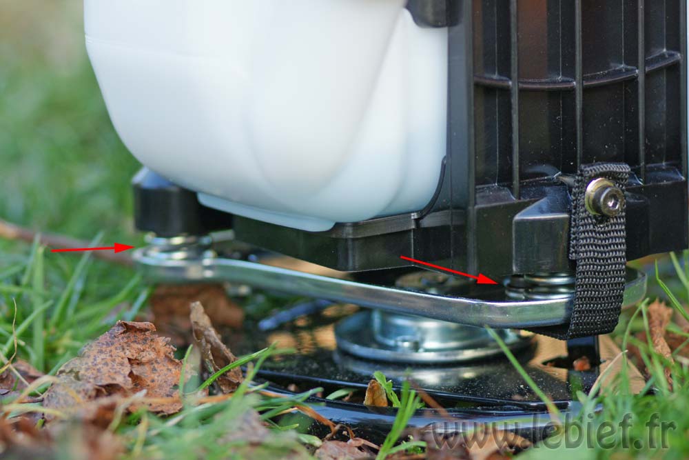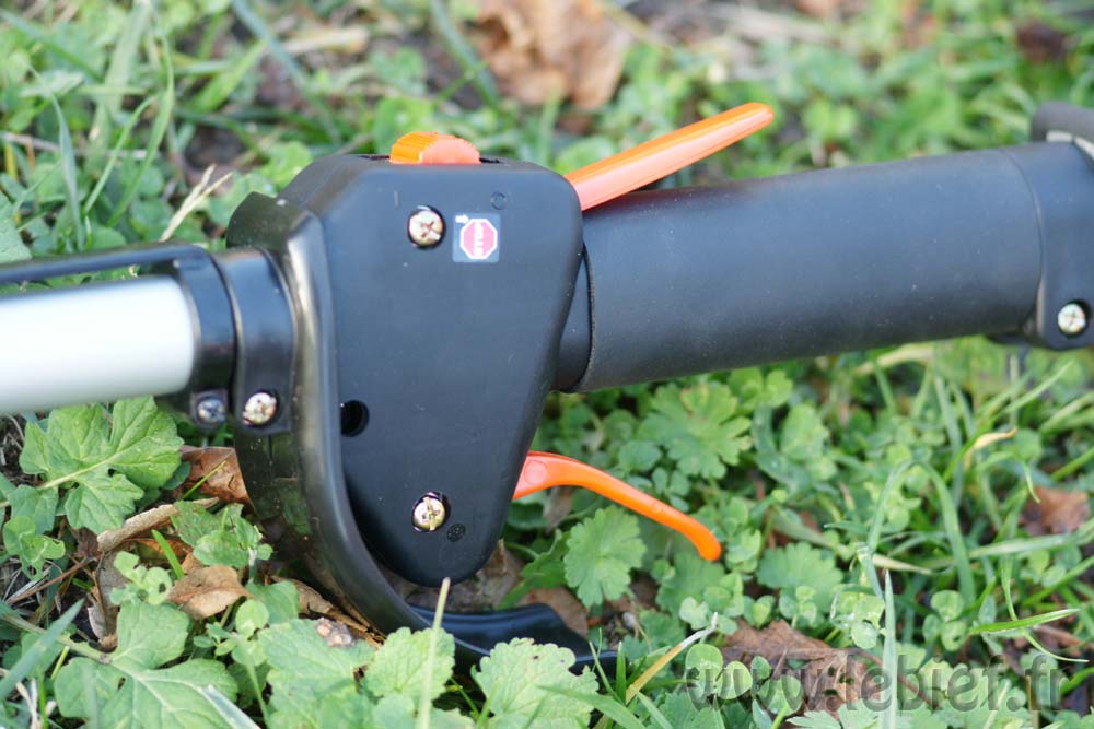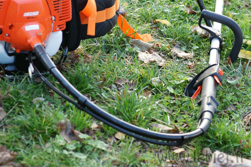 Une fois sur le dos, je me suis dit que cela allait être l’enfer de bosser avec de telles vibrations ! Mais en fait, dès les premières pressions sur la gachette d’accélérateur, ces vibrations se sont évanouies. Enfin presque, ça reste tout de même un moteur de mobylette sur un sac à dos, faut pas l’oublier. En tout cas, elle est très agréable à utiliser, bien qu’au bout de quelques minutes, j’ai quand même constaté que mes bras fatiguaient plus qu’avec ma débroussailleuse standard, en tige rigide, avec une poignée en U. Je verrai avec plus d’heures d’utilisation.