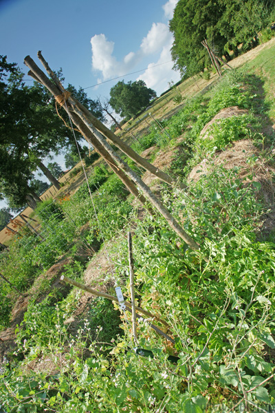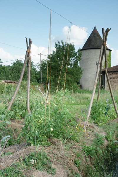 Voui voui voui… sur nos buttes où tout se mélange, il est bon d’avoir un fil directeur. Une direction ferme et métallique à suivre pour tous ces légumes indisciplinés et sauvageons. Un fil de fer qui ne chantera pas, mais qui élèvera tous ces végétaux rebelles vers des altitudes plus sereines. Comprendra qui pourra.