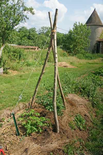 En ce qui nous concerne, nous avons jusqu’à aujourd’hui utilisé la solution des cages à tomates bricolées, les cages, pas les tomates (^_^) ! Ça marche plutôt bien, ne complique pas la récolte ou l’entretien du fait des larges mailles utilisées, mais par contre, ce n’est pas super esthétique, et surtout, vu le nombre de plants de tomates disséminés un peu partout, il en fallait un peu partout justement, et beaucoup, ce que nous n’avions pas. De plus, tous ces grillages partout…. pas glop… moche quoi. Mais efficace, après tout, c’est quand même le but.