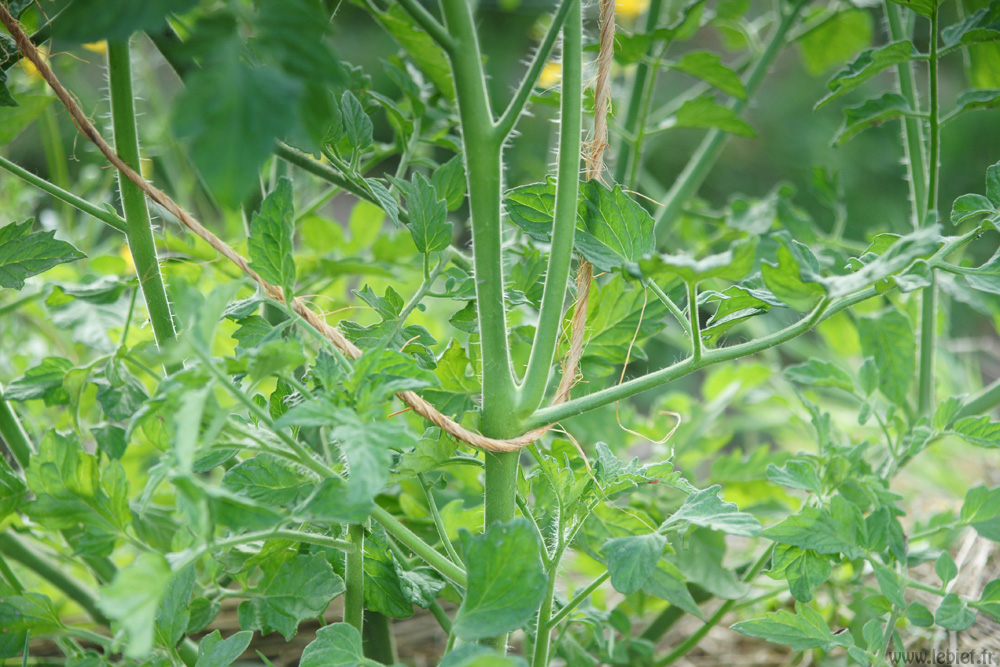 Une fois les trépieds installés, le câble tendu, il ne reste qu’à y accrocher les plantes que l’on veut. Pour ce faire, c’est très simple, avec une ficelle de son choix, on fait un grand « O » qui descend presque jusqu’au sol et on fait de simples boucles autour des branches à suspendre. C’est très rapide. Ensuite, il suffira régulièrement, au rythme d’un jardin familial qui pousse ça veut dire pas tous les jours, de refaire une petite boucle autour des nouvelles branches ou autours des anciennes qui auront poussé plus haut. On enroule la ficelle autour du plant, tout simplement. Dans la serre de nos amis, qui utilisent cette technique d’accroche depuis longtemps, les tomates montent pas loin des 2m, sans aucun soucis. Le plant est respecté, presque libre, juste soutenu. On aime.