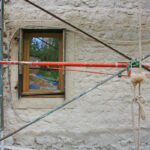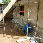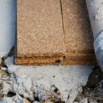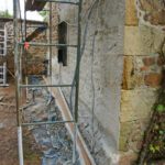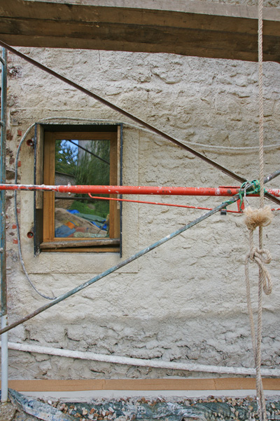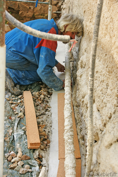 Et pourtant, quelle importance ! La pose d’une bande de liège, dans notre cas (car d’autres matériaux ou techniques sont envisageables, mais toutes avec le même but), à la base du mur, posée sur un petit lit de mortier de chaux, a pour but d’empêcher les remontées d’eau dans l’enduit terre-paille. Notons que l’ensemble reste perspirant, les échanges d’air sont toujours possibles. On ne pose pas son enduit sur un ruban plastique ou une dalle de ciment, ici en tout cas…