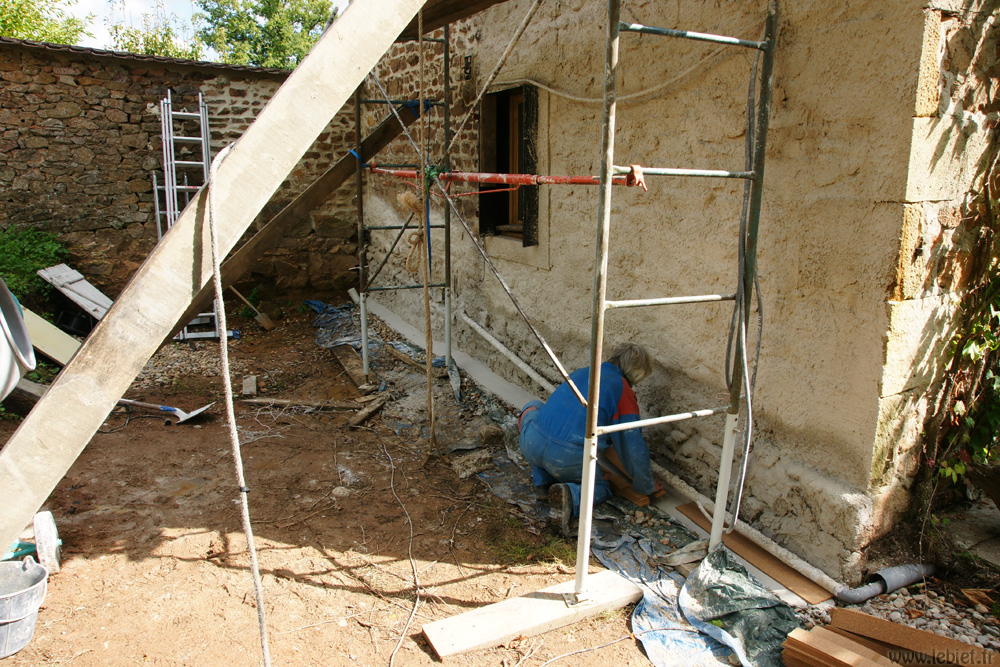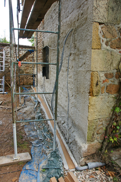 Si vous posiez l’enduit terre-paille du haut jusqu’au sol, l’eau remonterait par capillarité et le mur deviendrait une grosse serviette mouillée. Et on ne se réchauffe pas avec des serviettes mouillées ^_^