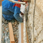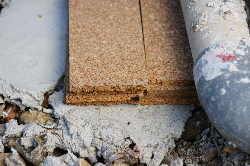 Par-dessus les graviers qui recouvrent et entourent le tuyau de drainage, on applique un ruban de mortier de chaux. On utilise ici des rubans de liège d’un demi-centimètre d’épaisseur, c’est tout ce que j’avais sous la main. Impossible de trouver autre chose ici, et j’en ai fait des magasins. Sinon, il fallait commander et attendre, mais comme j’étais bien organisé, j’ai fini par récupérer ces bandes. Peu importe, ça fonctionne aussi en superposant le liège.