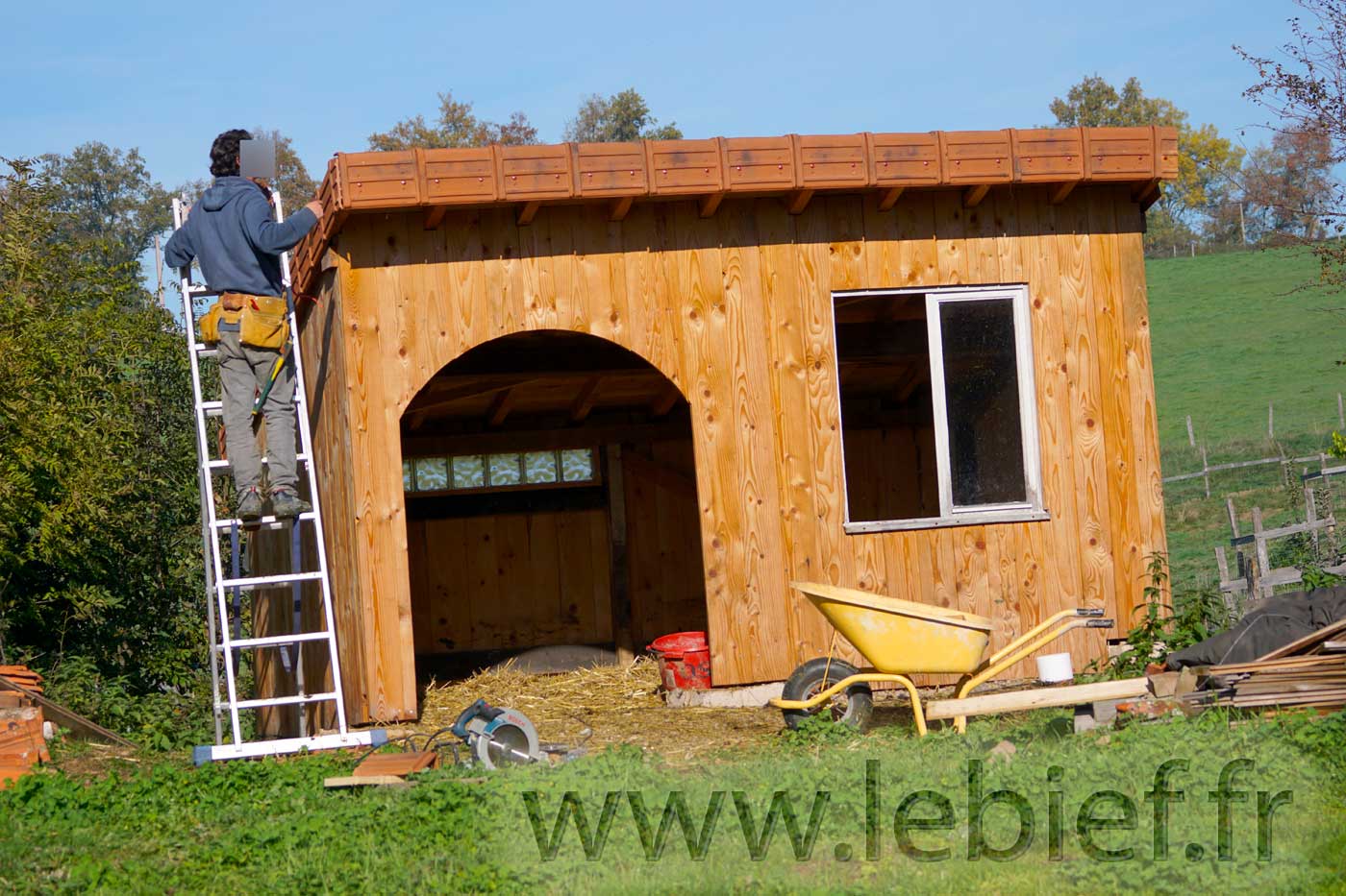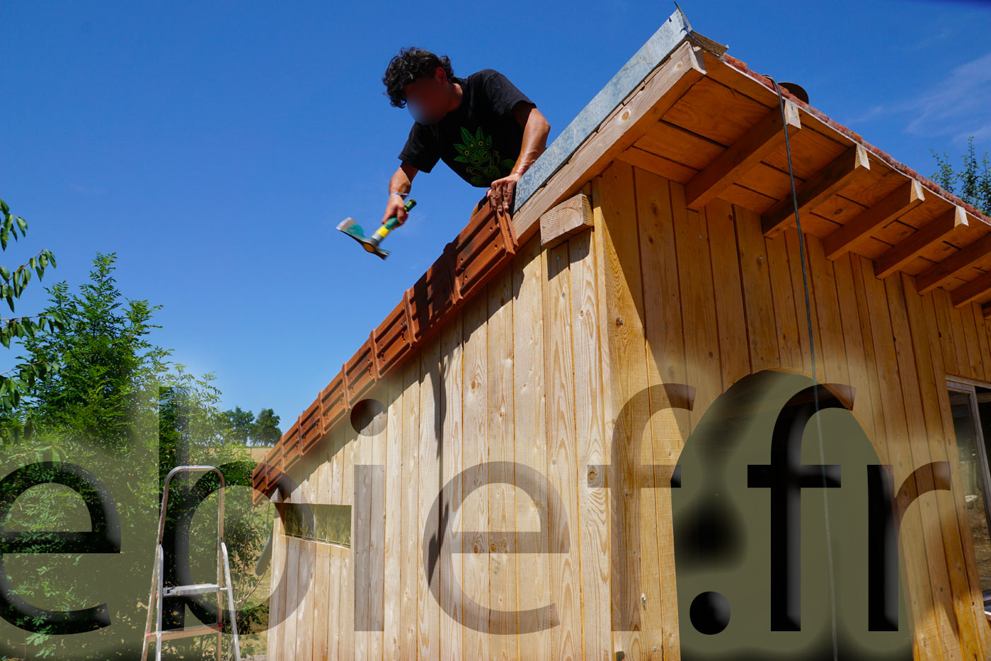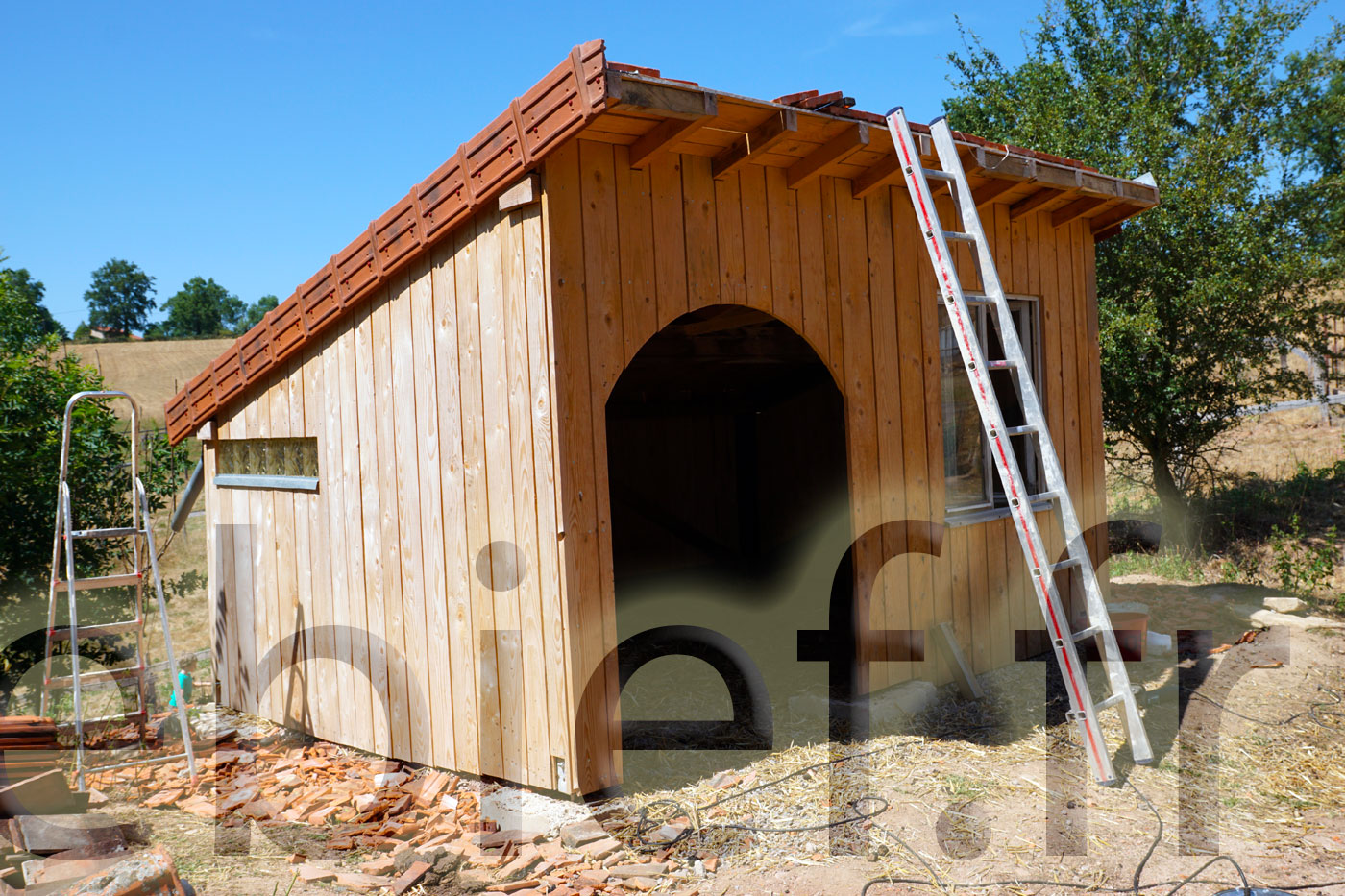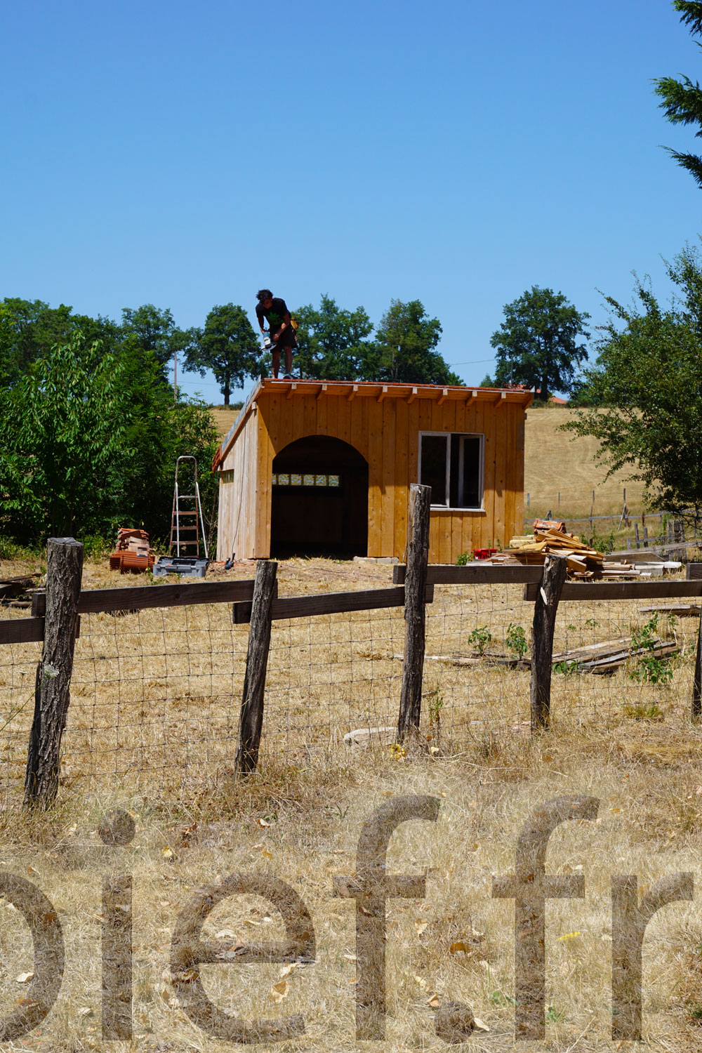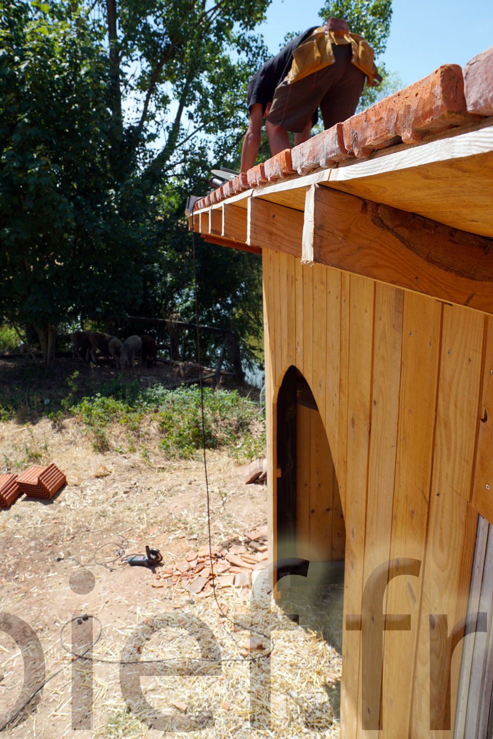 C’est aussi le bon moment pour finaliser ce bel abri à brebis, en lui installant ses tuiles de rives, et lui passer une belle couche d’huile de lin. Diluée, pour cette première fois sur ce bois brut, avec de l’essence de térébenthine pure gemme 1, ben oui, c’est qu’on les aime nos petites brebis !