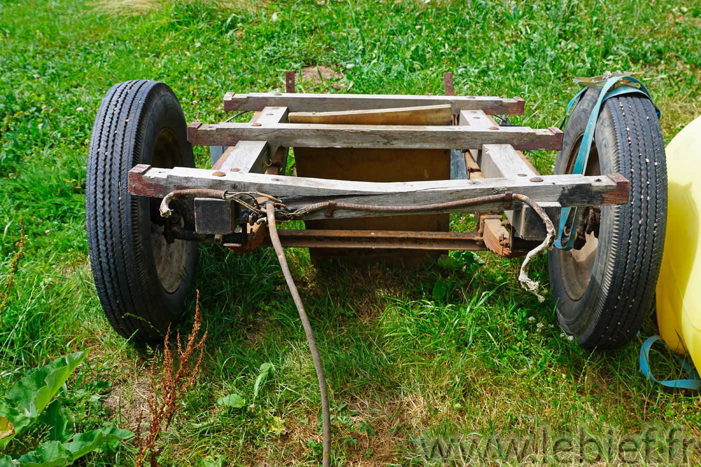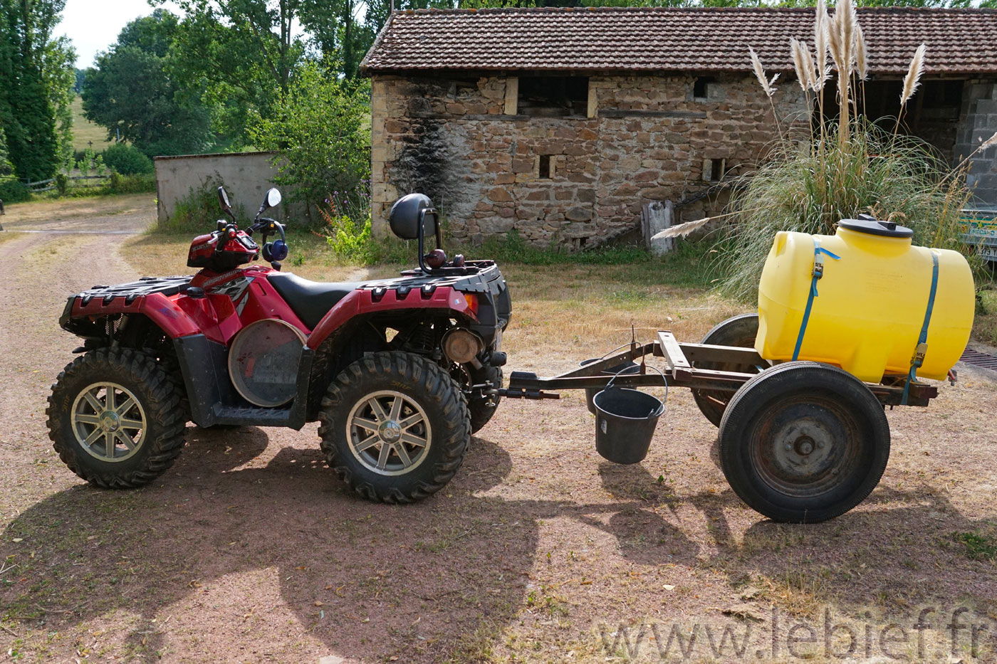 Bien que la citerne ne fasse que 200l, cela reste toujours une grosse masse d’eau qui va peser de tout son poids sur ce qui la supporte, notamment lors des nombreux à-coups dus aux nombreux trous et autres formations creuses ou bossues des pâtures traversées.