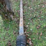 Eh oui ! De nombreuses années plus tard, la voilà en tout cas à nouveau à l’air libre cette grille, prête à recueillir à nouveau les eaux s’écoulant par la sortie. Pas l’eau de vidange, car la pression et le débit y sont là bien trop important pour ce tuyau de quinze / vingt cm de diamètre. Mais les eaux de ruissellement qui s’échappent et coulent par là, oui !