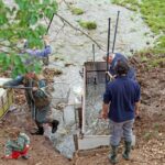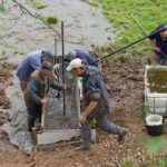 Et puis, il a fallu aussi faire tout cela avant que notre équipe d’experts ne vienne installer le système de pêche déjà utilisé par le passé. Il faut déjà bien du temps pour le mettre en place, et le fixer solidement en l’arrimant avec de gros piquet en bois à enfoncer profondément. Il faut dire que la pression de l’eau sera forte.