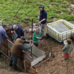 - Des volontaires. Oh oui ! C’est vraiment mieux à plusieurs ! Car la pêche est brève, mais intense. Il faut donc des bras, des grands, des petits, ils sont tous les bienvenus. C’est aussi ce qui rend ce moment toujours assez intense émotionnellement (nos vieux instincts de chasseurs face à l’abondance sûrement, ou la joie de partager une tâche commune dans la bonne humeur et l’attention. Ou la tension, je ne sais plus… En tout cas, merci encore à tous, comme d’hab, nous somme toujours très heureux de voir venir tout ce petit monde, curieux et motivé, sympathique et courageux, volontaire et audacieux, imaginatif et collaboratif. Troisième vidange et troisième aperçu de la gentillesse et de la sympathie des amis et habitants du coin ou non qui viennent nous aider chaque année.