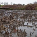 La partie arrière-droite est bien envasée. Un réseau racinaire très important retient le tout en une masse compacte, étouffante. Le niveau de l’eau est bas et, en été, j’y ai même observé des zones entières au-dessus du niveau de l’eau. Creuser un chenal permettrait aux poissons de mieux circuler, ainsi qu’à une eau plus fraîche.