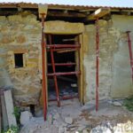 Mais voilà, un vilain coup de vent a, cet été, un peu accéléré le processus, et j’ai dû très rapidement modifier mes plannings ministériels pour opérer le malade sur le champ. En commençant par étayer un peu mieux tout cela, car ouida! Avant, ça tenait juste avant avec l’étai de droite, celui devant le vilain mur de ciment, qui cela dit, maintient aussi, tel un plâtre (le comble du ciment!) sur un membre partiellement émietté, ce mur encore debout. Il nous doit bien cela car, grâce au ciment qui a contribué à la chose, le mortier de chaux existant, ne pouvant respirer grâce à ce matériau gris et étanche qui le recouvre, a plus rapidement perdu de sa superbe.
