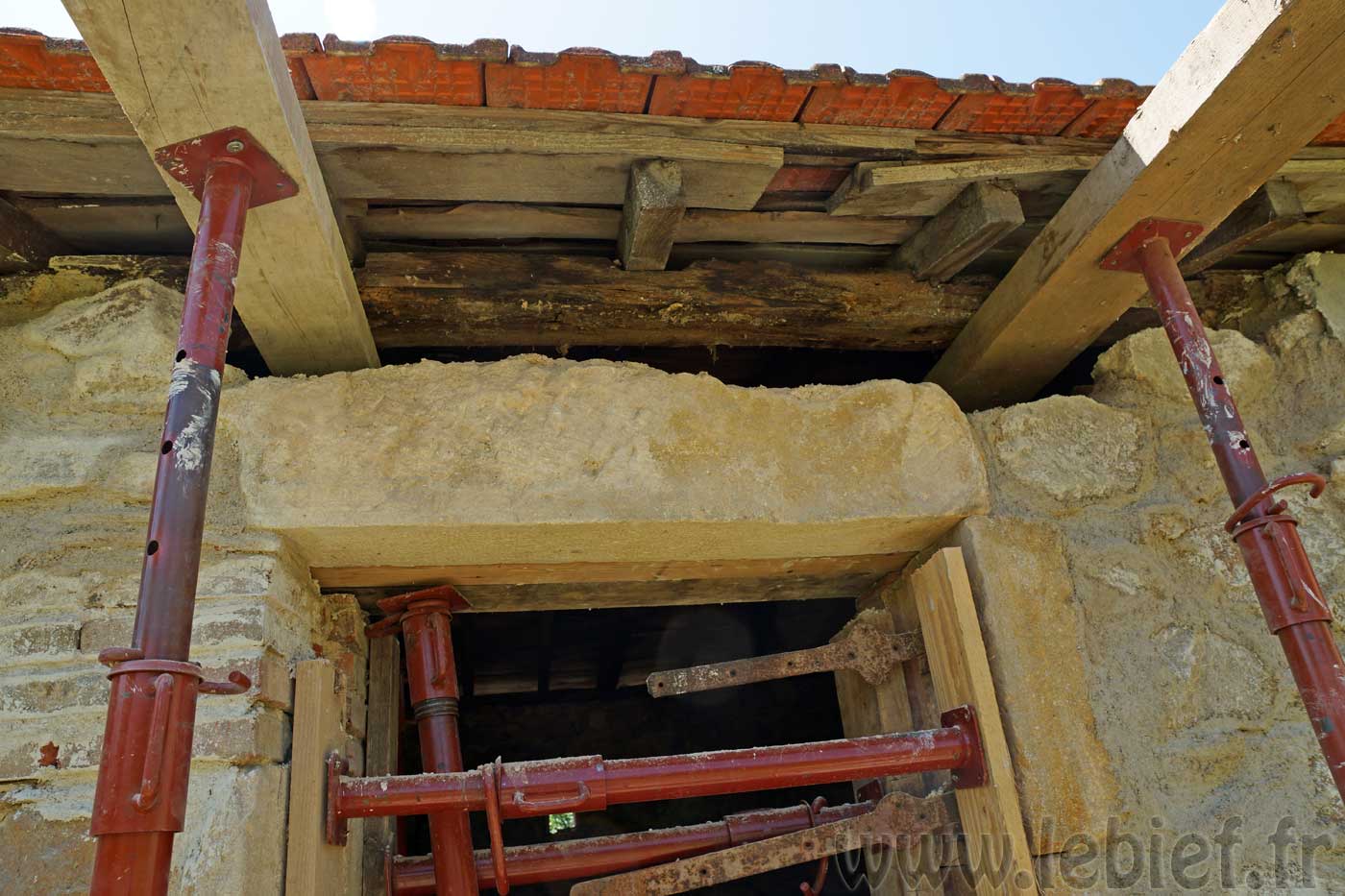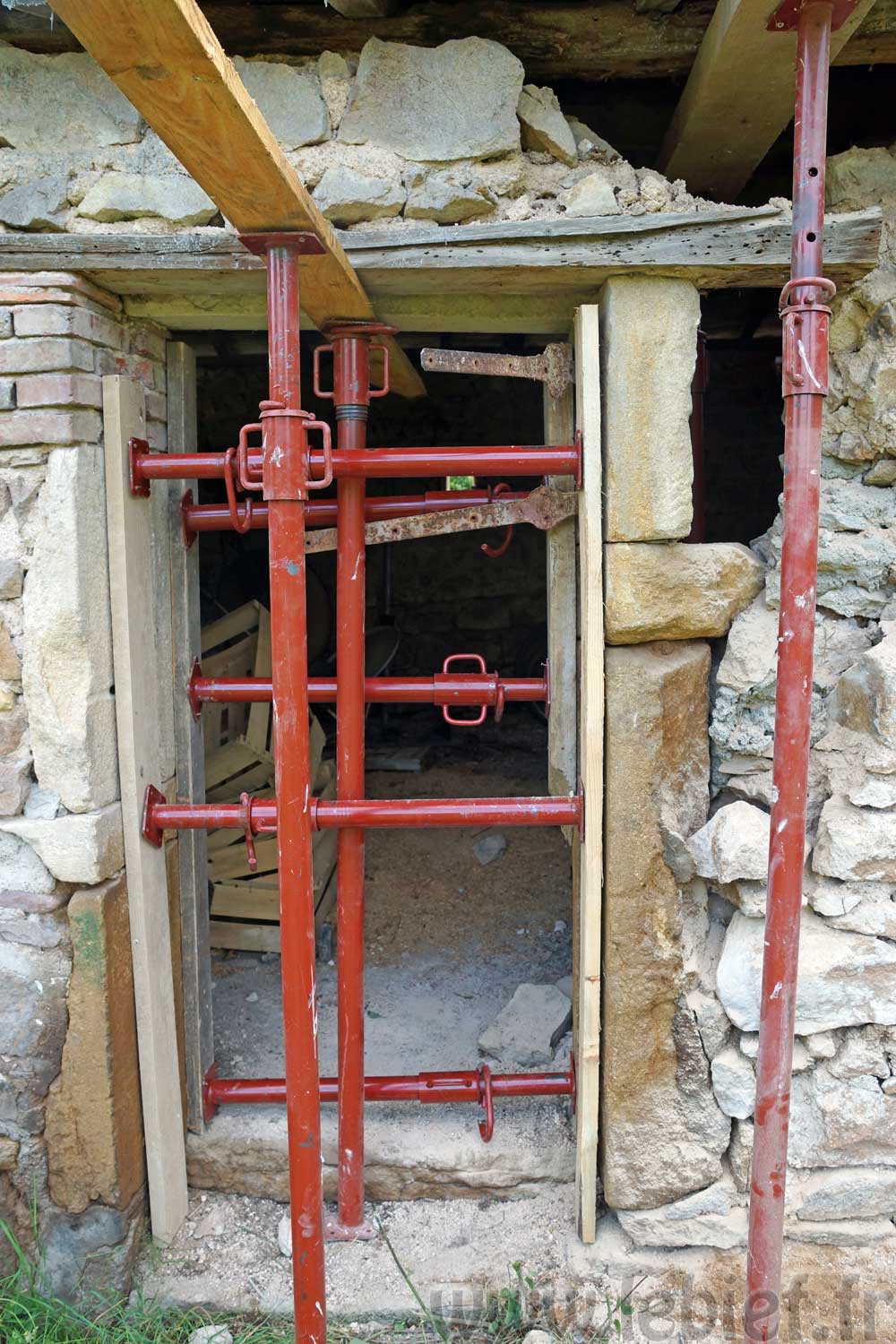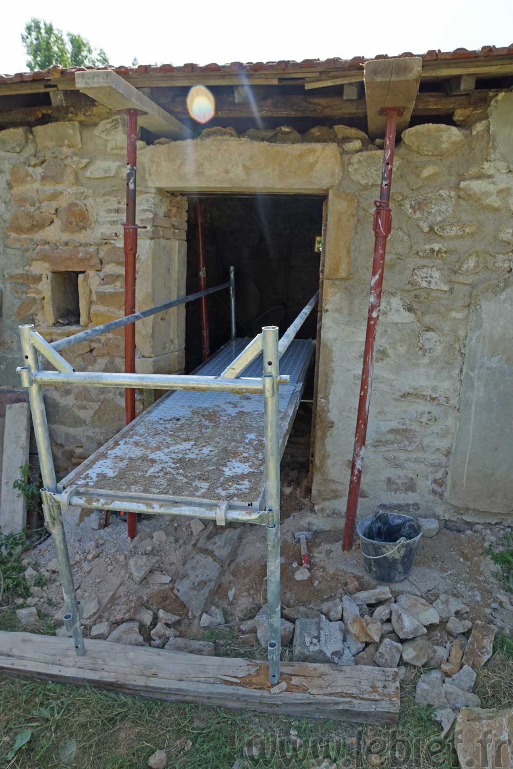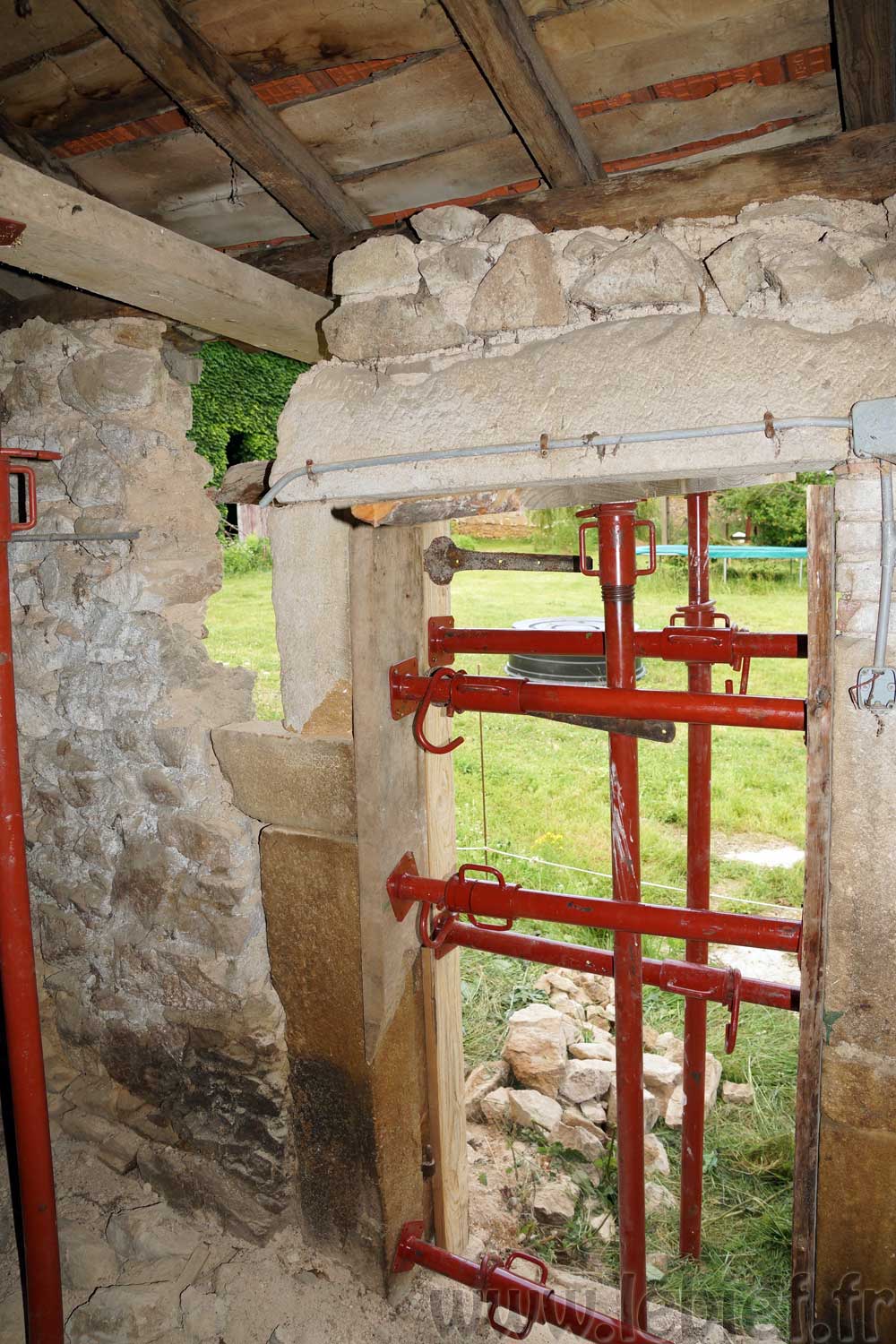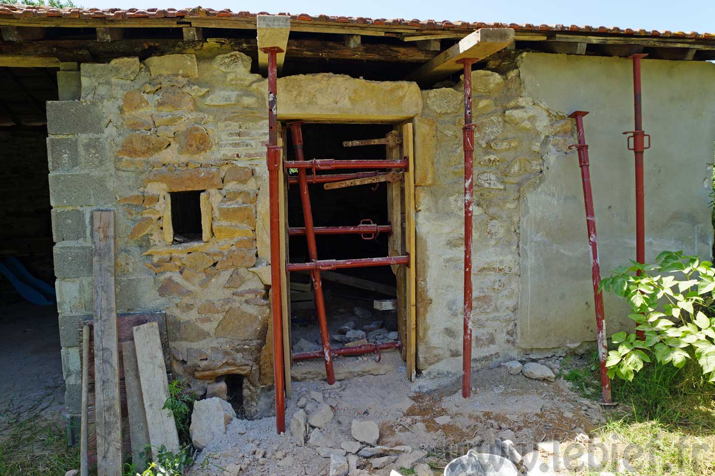 J’ai, avec un petit coup de main donc, étayé plus sérieusement la toiture et la porte existante, comme sur la photo ci-dessus, afin que tout ceci se stabilise un peu, que je puisse tout de même travailler un peu plus en sécurité, voire travailler tout court en fait. :p