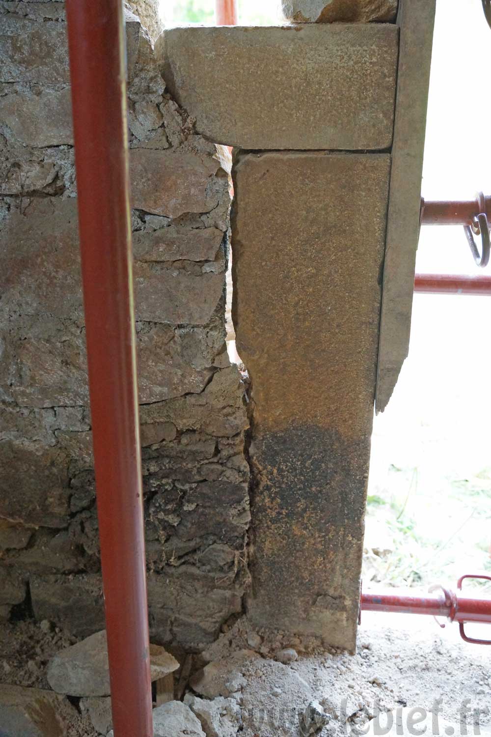 - une partie du bâtiment ne s’effondre, occasionnant alors des travaux d’un coup beaucoup plus lourds, et pas seulement financièrement. Je pense là aux heures supplémentaires de travail, et surtout à ces jambages en pierre (les gros cailloux jaune verticaux (non, ce n’est pas le nom d’une nouvelle couleur … )) que, franchement, je n’avais pas du tout envie de devoir ensuite remettre debout, chacun faisant ses dizaines de kilos chacun.